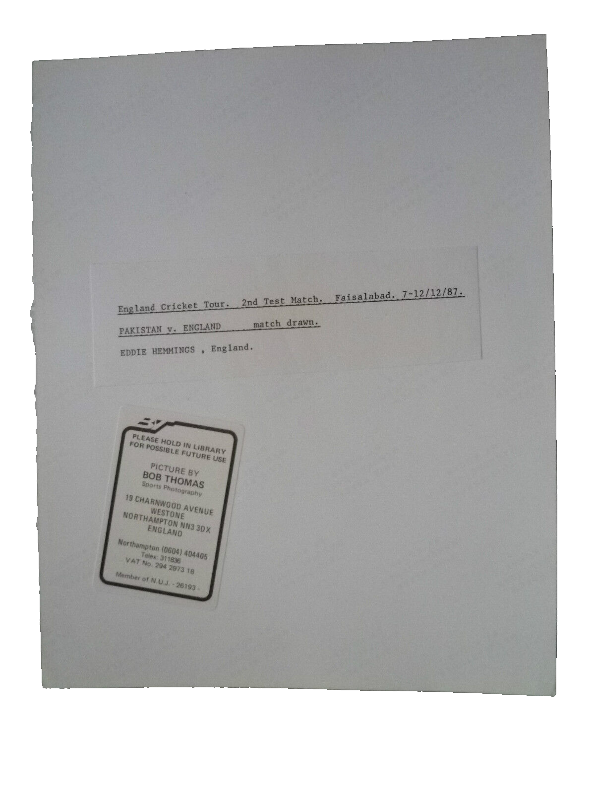You are purchasing very collectable & Original press photograph. Eddie Hemmings England v Pakistan, 2nd Test 1987 Original Press Photo
