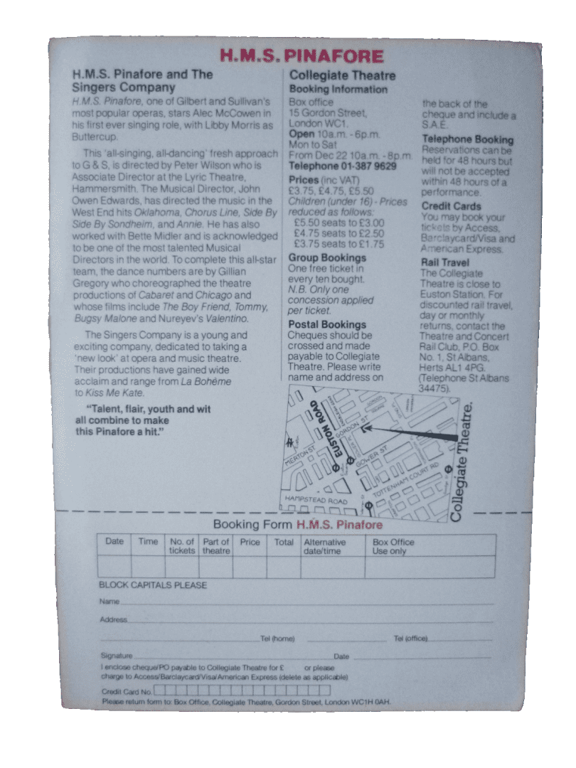 You are purchasing vintage & original : GILBERT & SULLIVAN OPERAS HMS PINAFORE Collegiate Theatre FLYER~A McCowen & Others