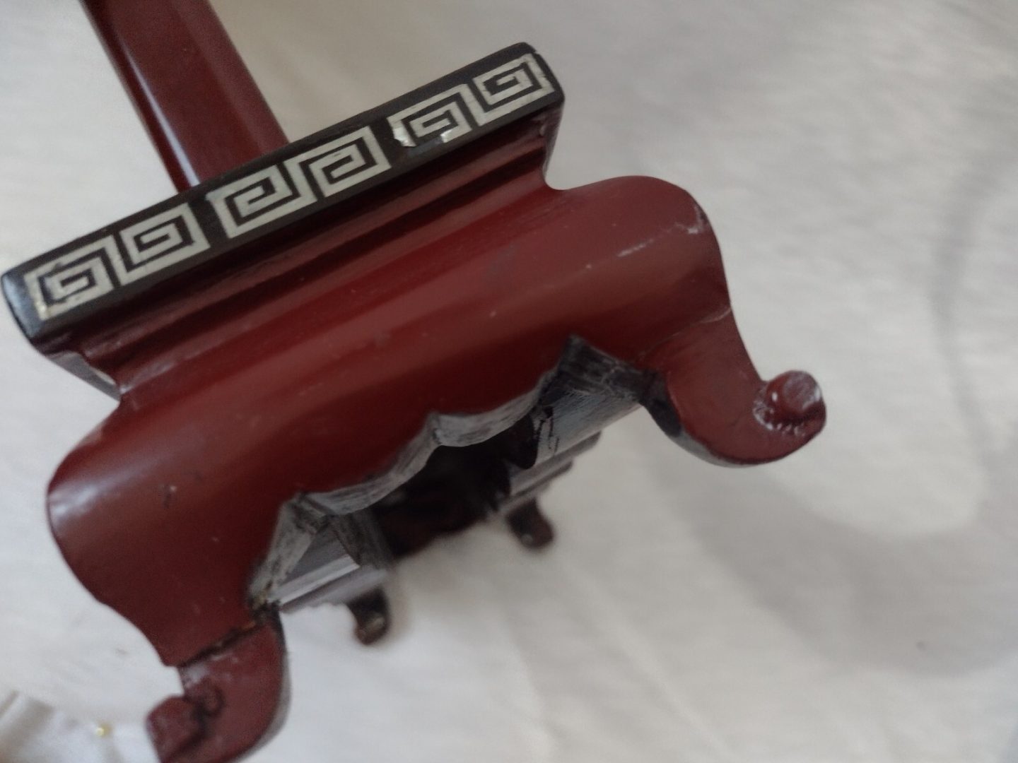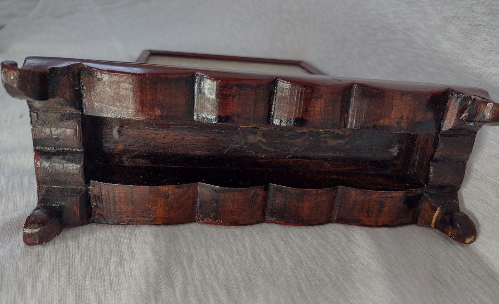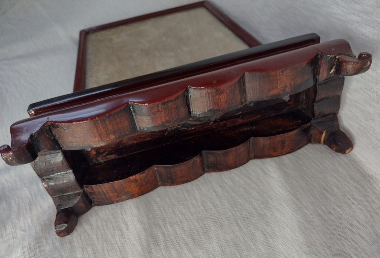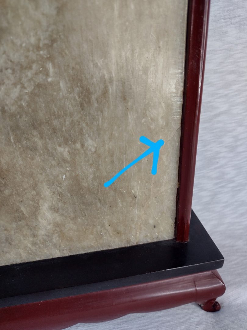 Size approximately Height 28 cm x Length 22 cm x Width 8 cm. I believe this to be an Original item, Wood Stand 2 legs are repaired and Plaque has minor crack marked otherwise in good condition…Please study pictures carefully to decide. Incredible detail on the item. Incredible detail on the item