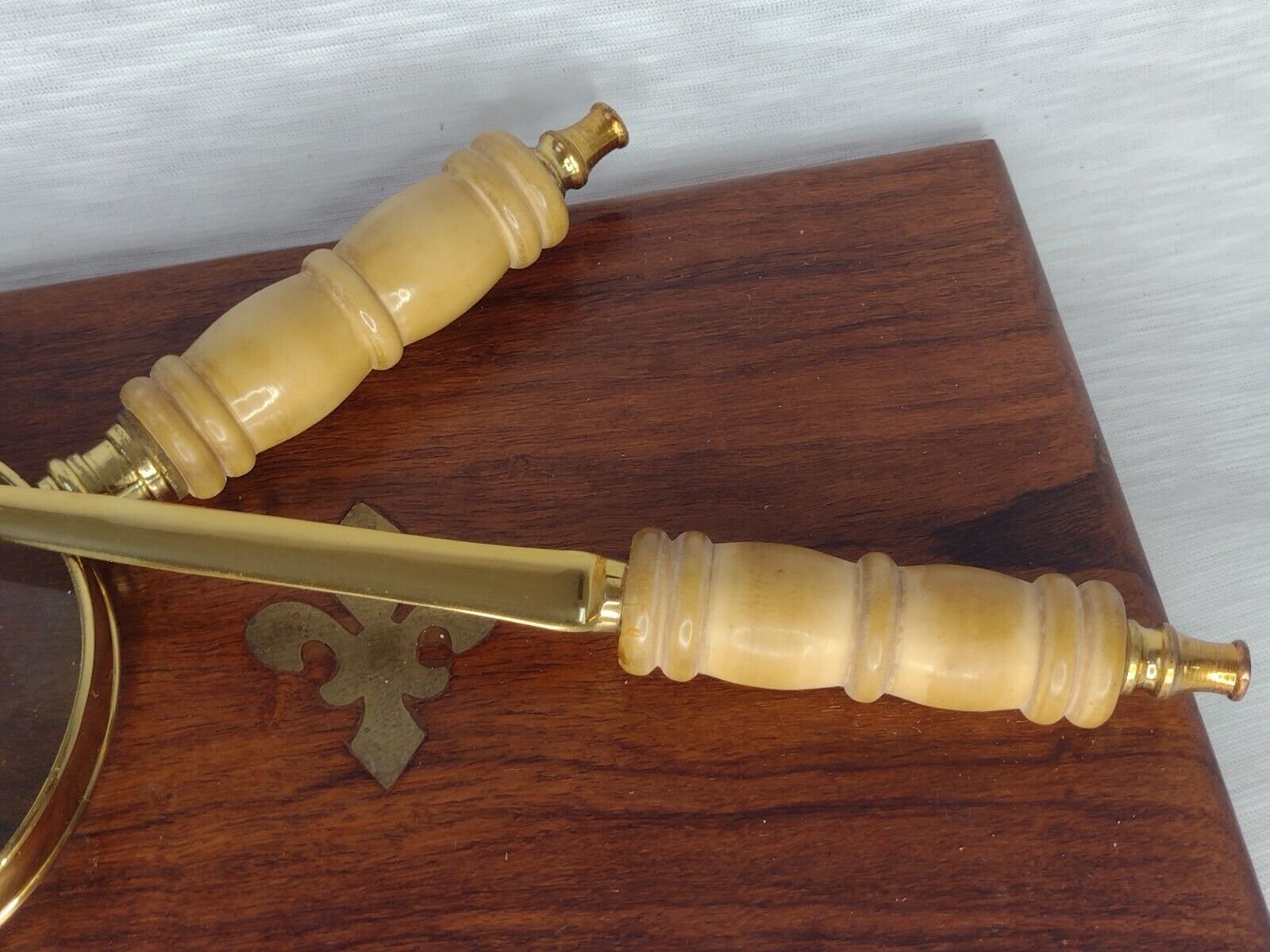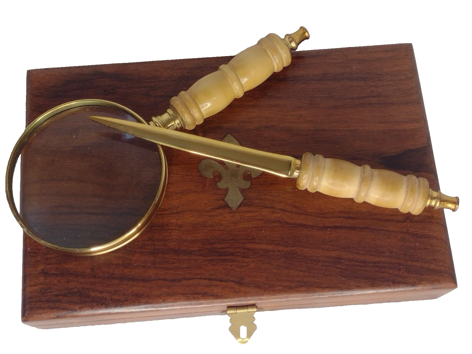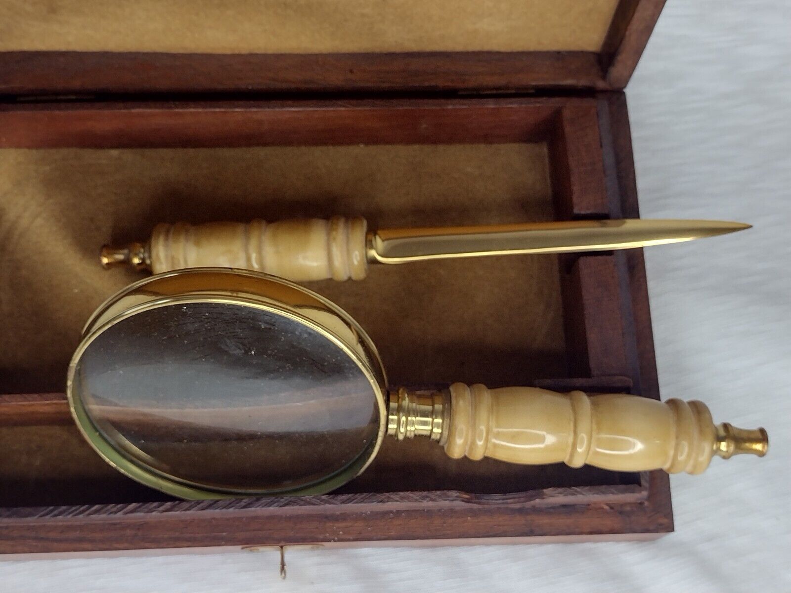 Magnifying Glass And Letter Opener Set Original Wooden Box Solid Brass Vintage
