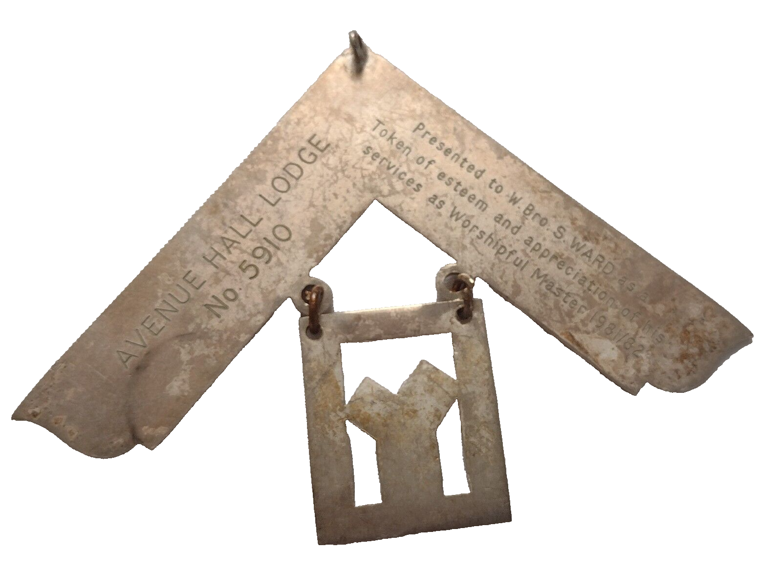 Seller note: (Size approximately 90 mm tall & 128 mm wide) Avenue Hall Lodge No 5910. Masonic Jewel Presented To W Bro S Ward as a token of Esteem & Appreciation of his Services as Worshipful Master 1981/82 ...Silver Plate.... Please study pictures carefully to decide
