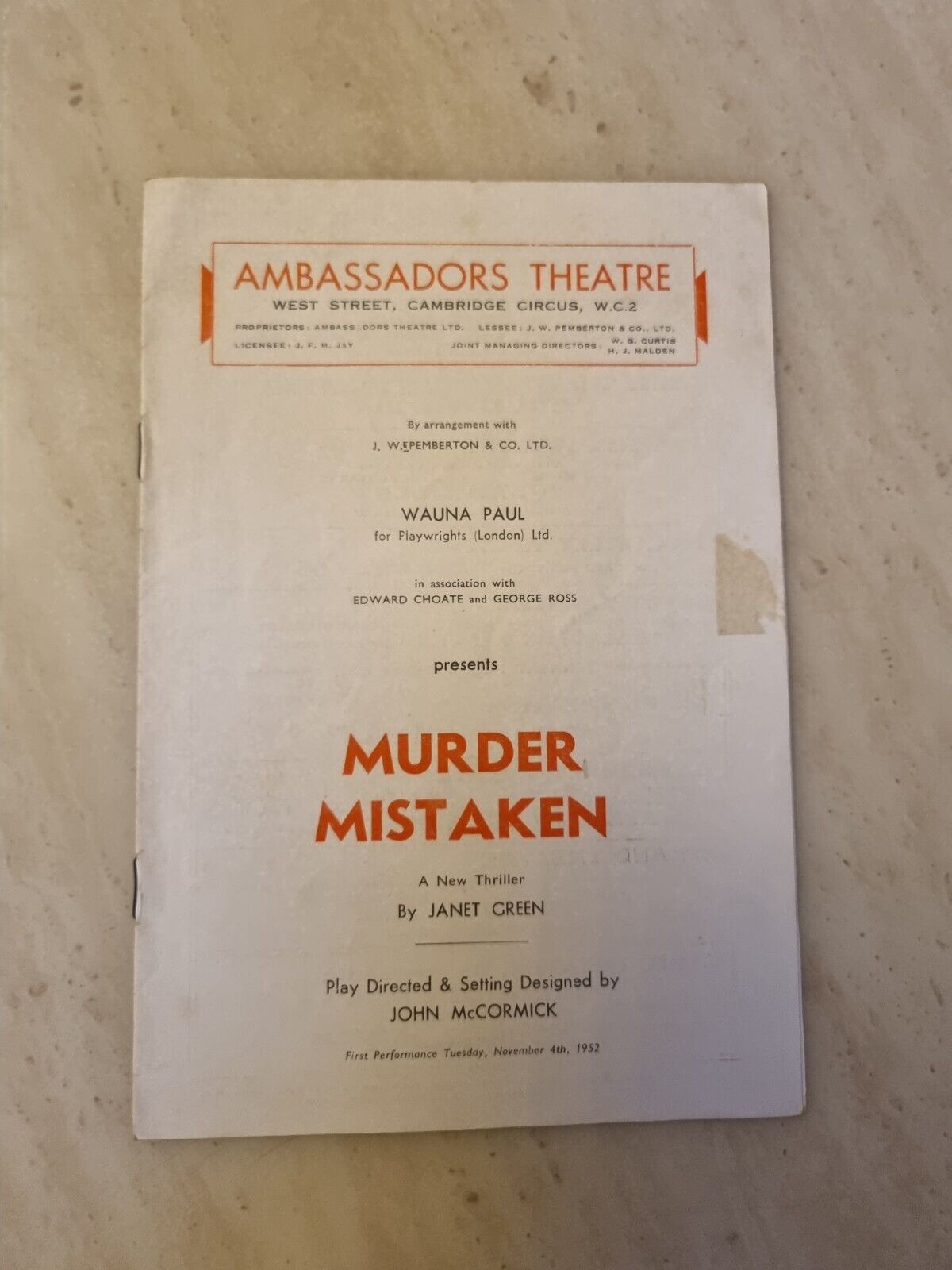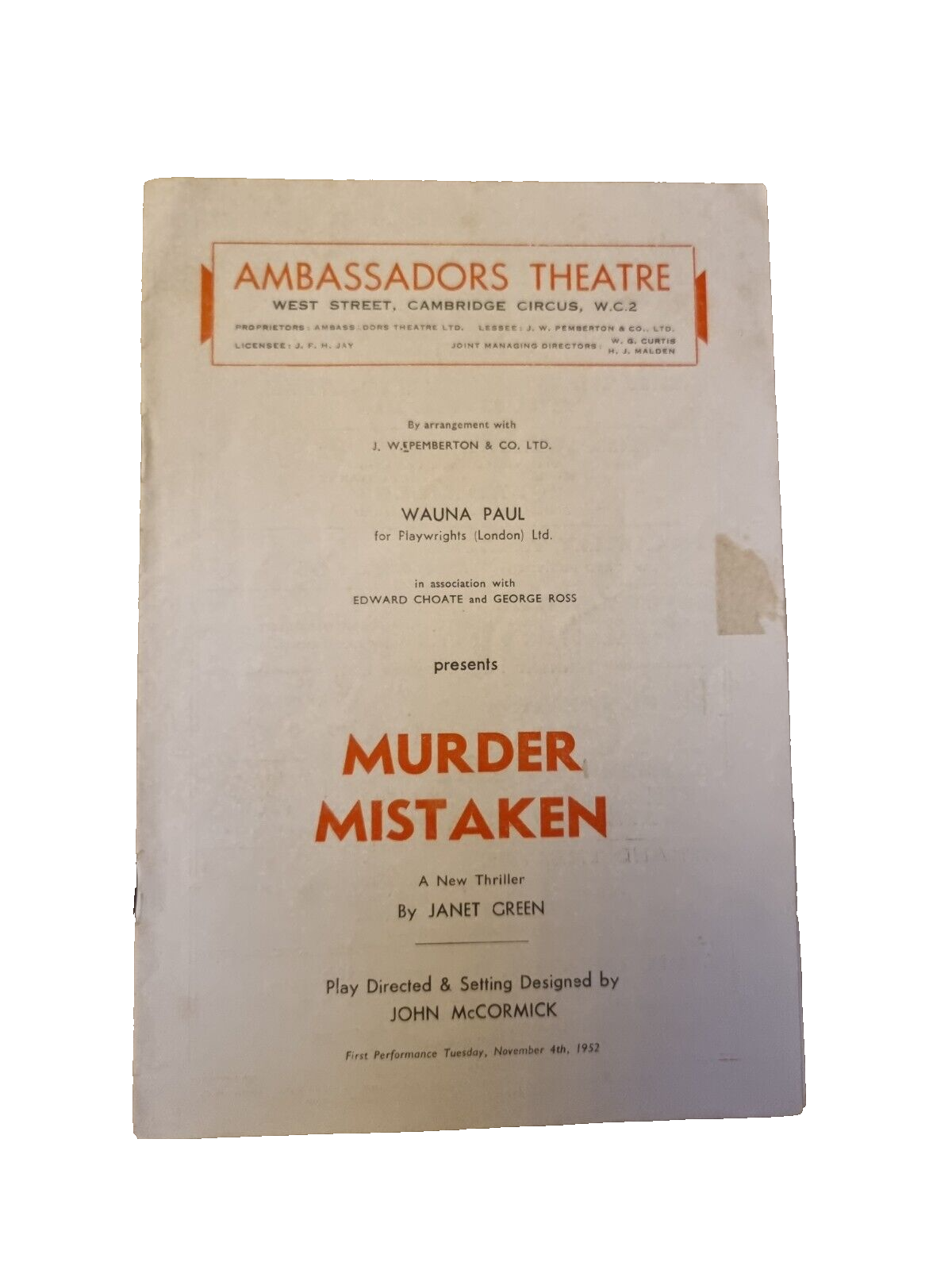 "This lovely Original Theatre programme remains in very good condition for its age. Please see the picture as it forms part of the description."