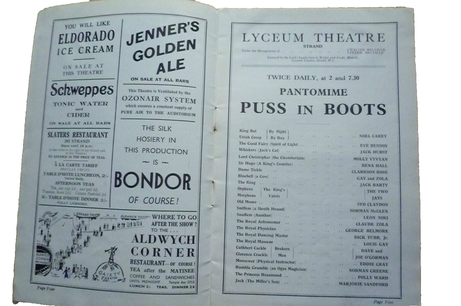 You are purchasing an original vintage very collectable Theatre programme from unknown date: LYCEUM THEATRE PROGRAMME- PANTOMIME PUSS IN BOOTS by Walter & Fredk. Melville