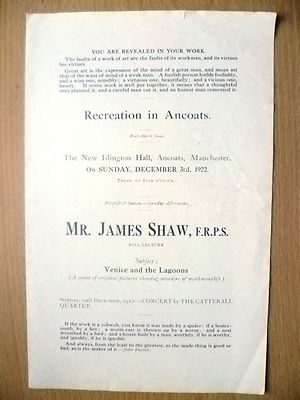 You are purchasing very collectable & Original threatre programme of : Recreation in Ancoats 1922, 3rd December~ MR. JAMES SHAW,F.R.P.S~Subject: Venic and the Lagoons, Concert by The CATTERSLL QUARTET