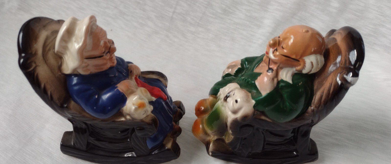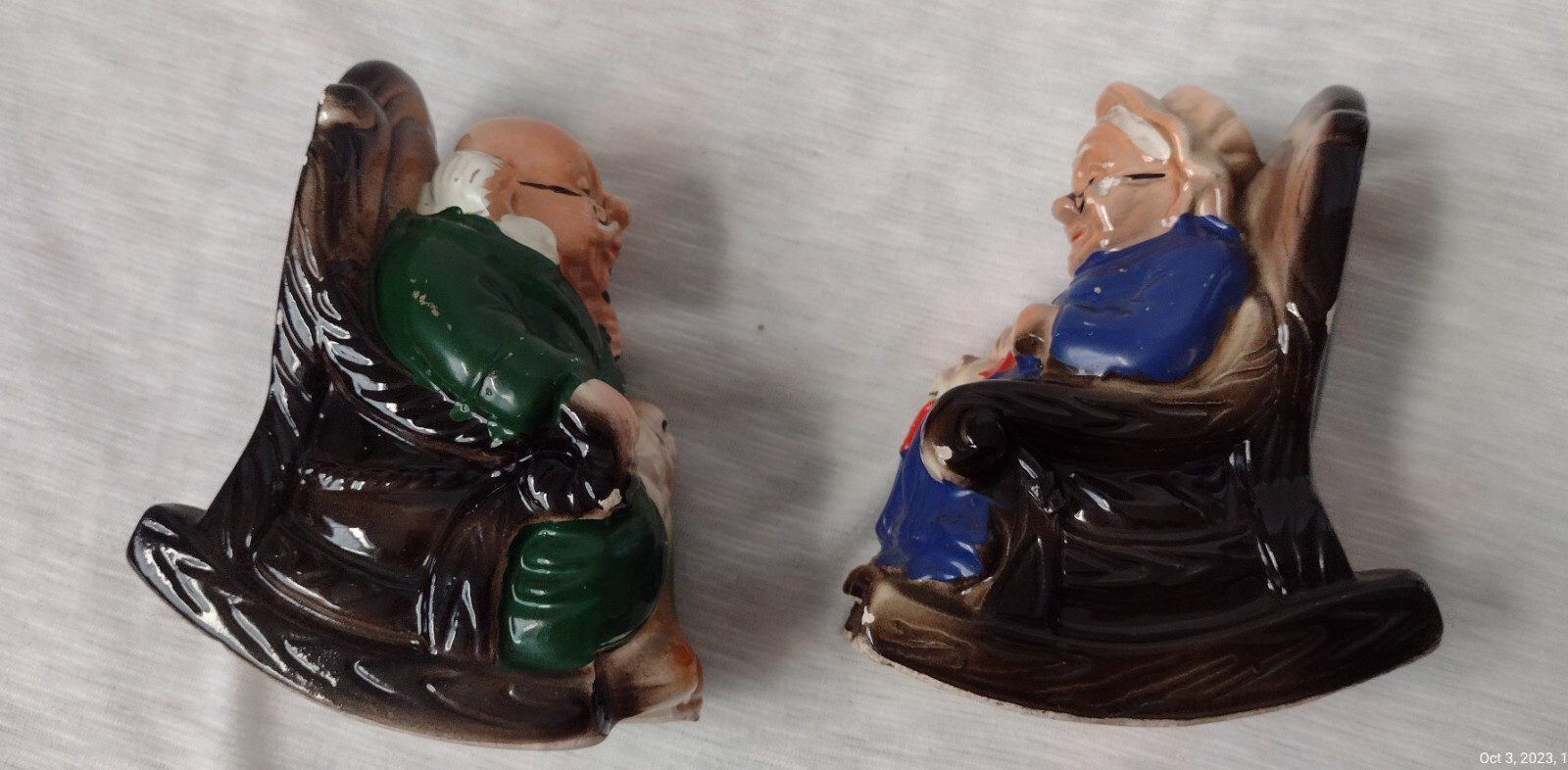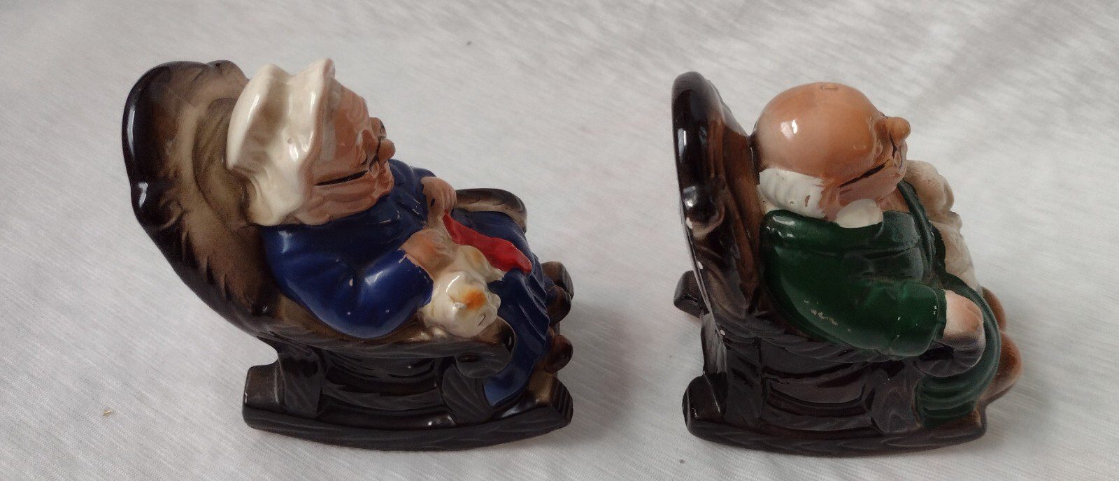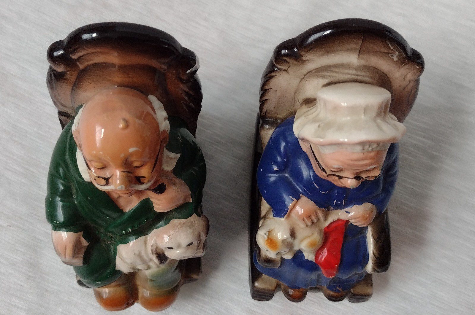 Retirement Fund Piggy Bank Grandma Grandpa Rocking Chair Cat & Dog Japan – Pair——- I believe this to be an original item, in very good condition but showing genuine signs of age….Vintage items…..Please study pictures carefully to decide.