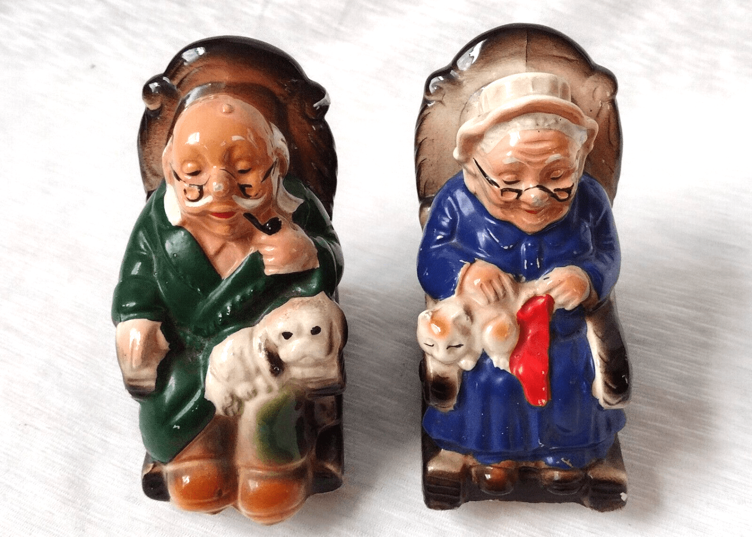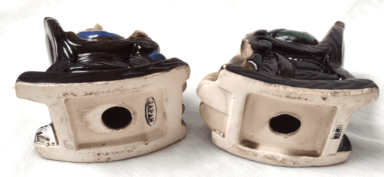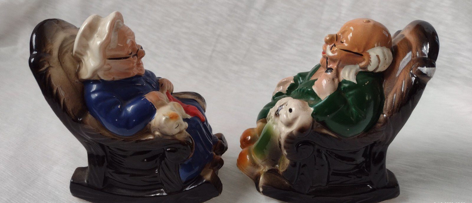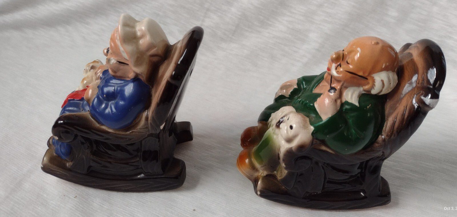 Retirement Fund Piggy Bank Grandma Grandpa Rocking Chair Cat & Dog Japan – Pair——- I believe this to be an original item, in very good condition but showing genuine signs of age….Vintage items…..Please study pictures carefully to decide.