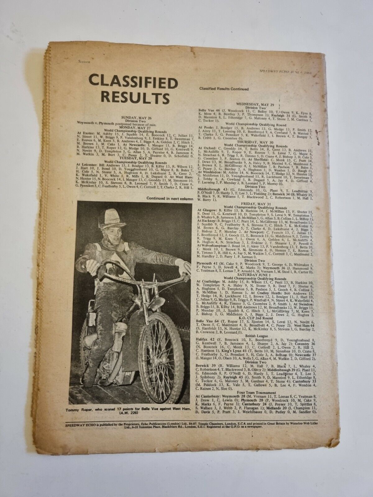 SPEEDWAY ECHO – WIMBLEDON v KING’S LYNN – 6th June 1968