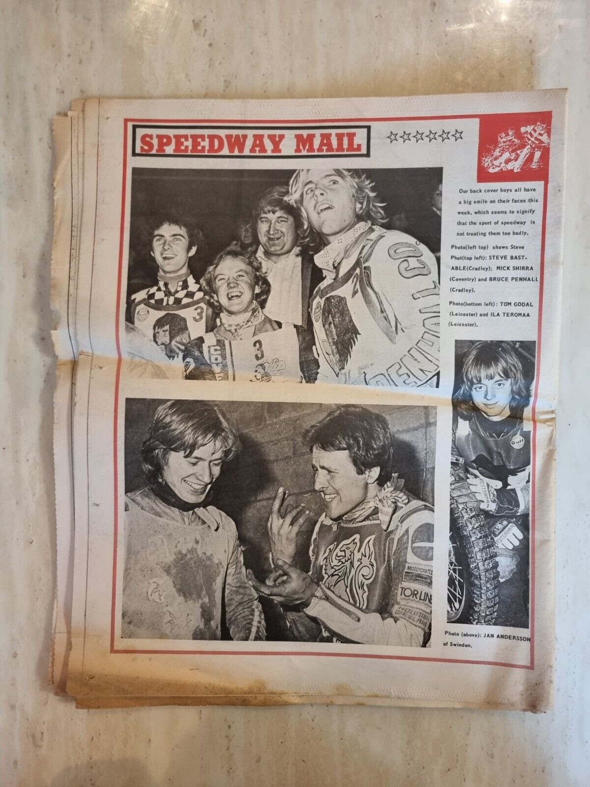 You are purchasing very collectible speedway magazine/Newspaper SPEEDWAYMAIL. The Magazine features photos and articles on Speedway racing stars of the day. Please note that the magazine has fold, wear and tears to the edges and some discoloration may be found in some of the pages , otherwise it is in good overall condition for its age. Please see picture as it forms part of the description.