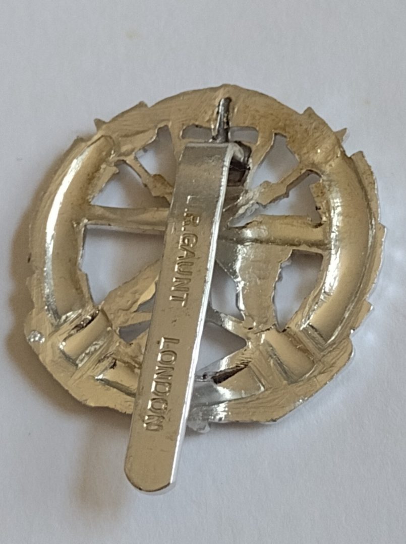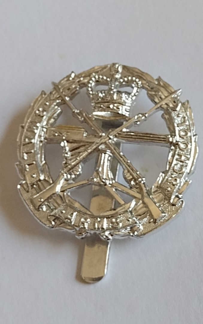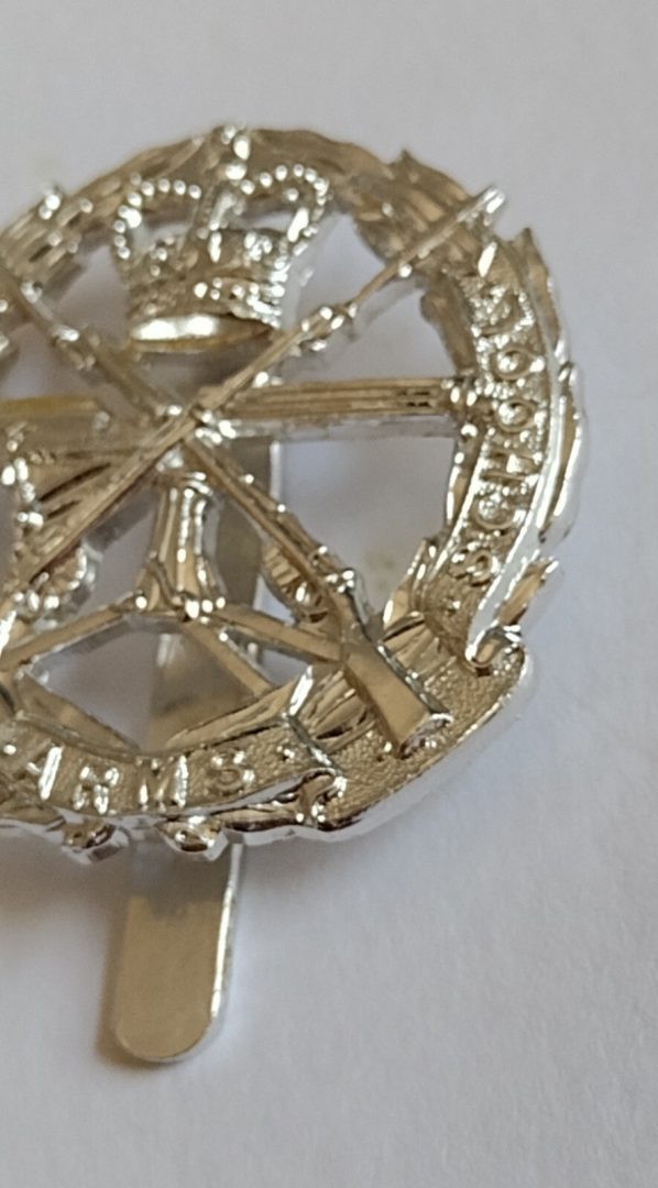 Staybrite Small Arms School Corps Cap Badge QC EIIR Issued maker Gaunt Anodised