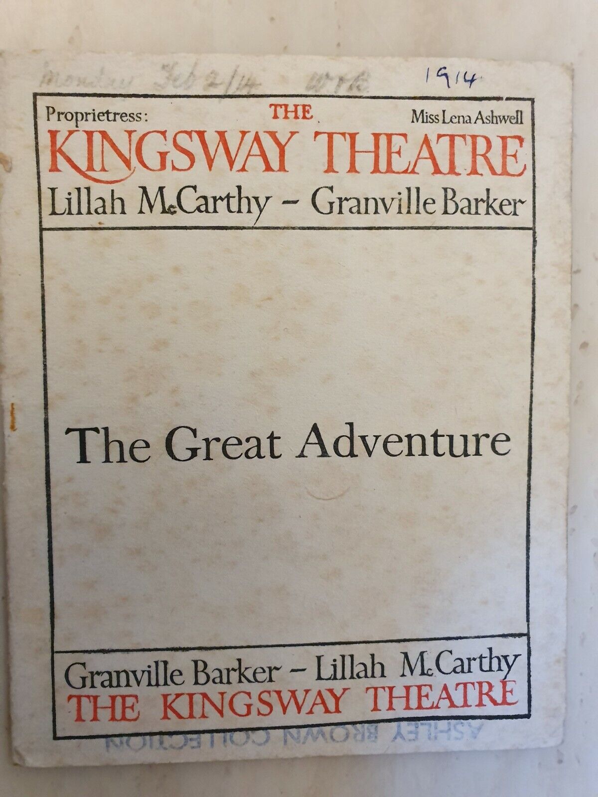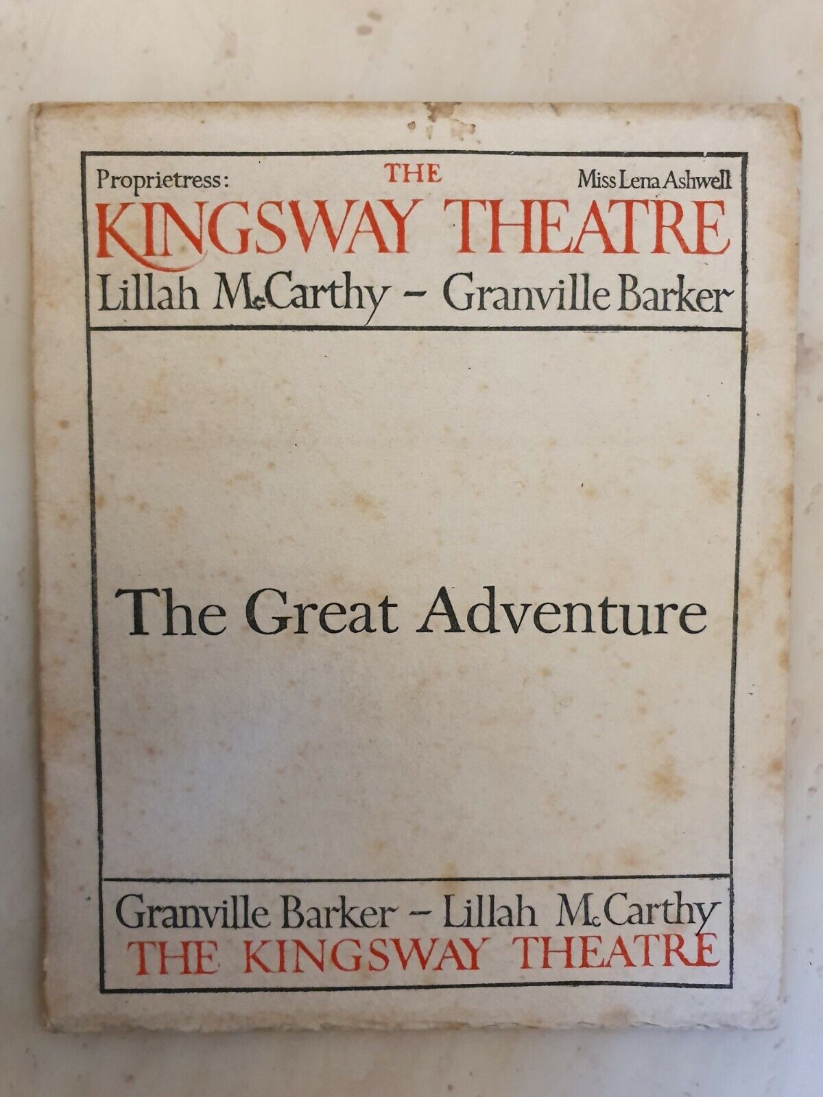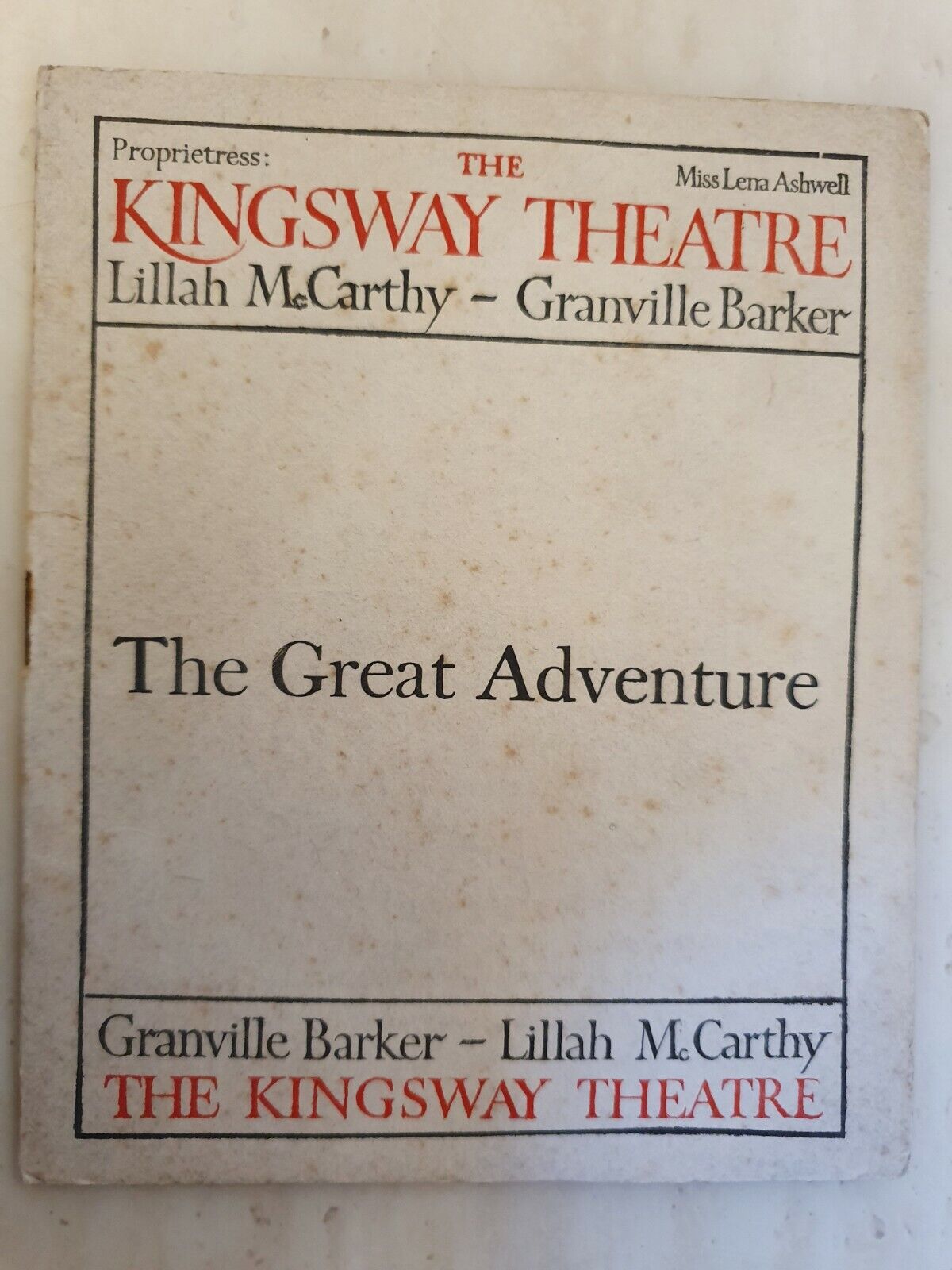 THE GREAT ADVANTURE – LILLAH McCARTHY GRANVILLE BARKER 1913 KINGSWAY THEATRE