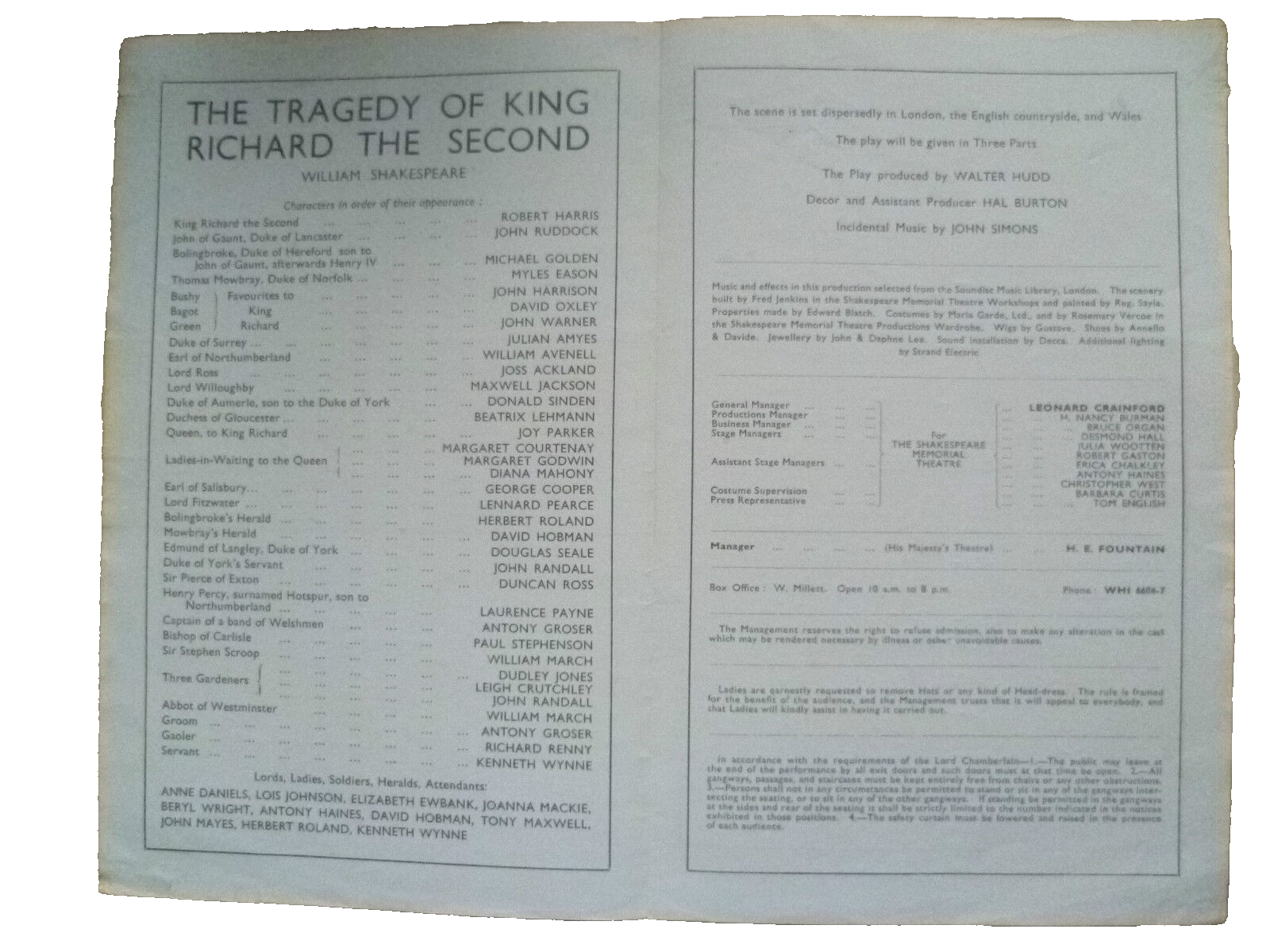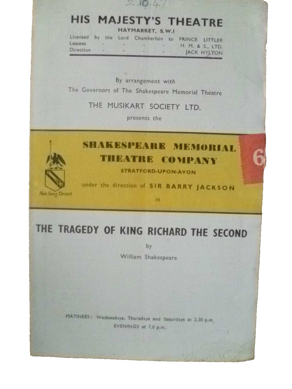 You are purchasing vintage & Original theatre Programme of : Shakespeare Memorial Theatre Company- THE TRAGEDY OF KING RICHARD TH SECOND~W Shakespeare