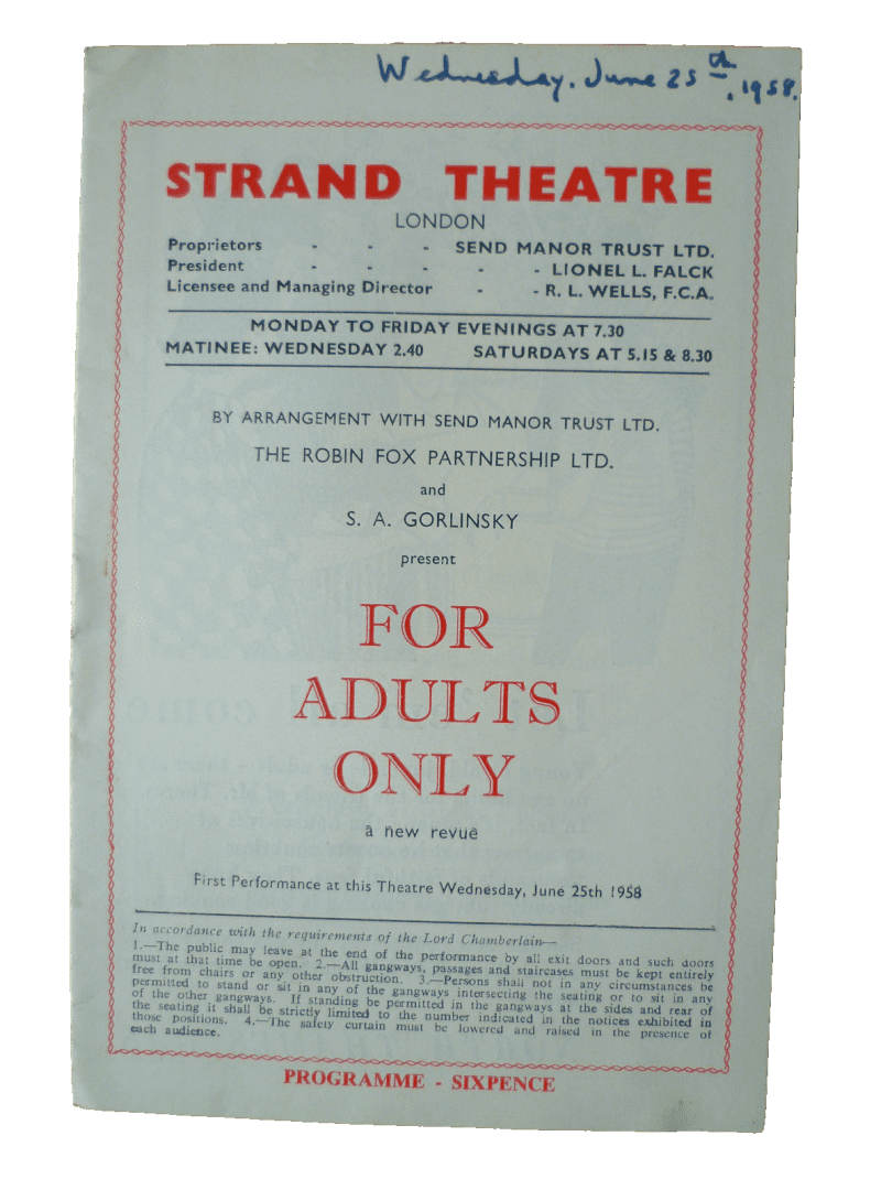 You are purchasing an original vintage theater Programme from: 1958 STRAND Theatre Programme: FOR ADULTS ONLY BY MICHAEL CHARNLEY