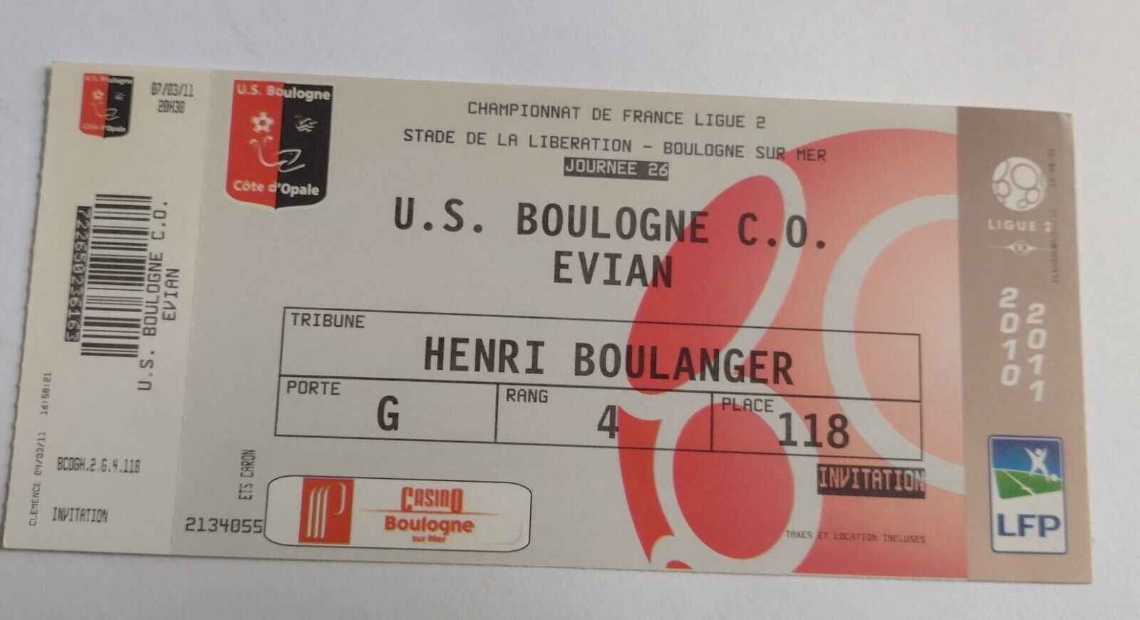 Ticket 2010 US Boulogne V Evian 26 January French League 2 Championship