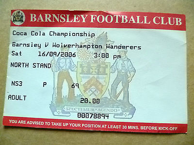 You are purchasing very collectable & Original sports ticket stubs of- BARNSLEY v WOLVERHAMPTON WANDERERS, Coca Cola Championship, 16 Sept 2006