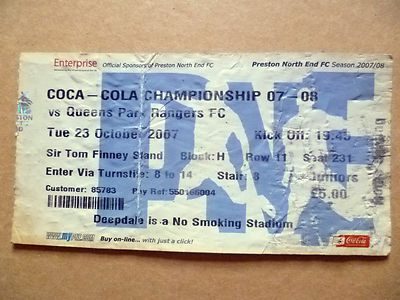 You are purchasing very collectable & Original sports ticket stubs of- PRESTON NORTH END v QUEENS PARK RANGERS,Coca Cola Championship,23 Oct2007