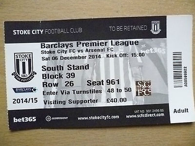 Ticket Stoke City v Arsenal 6 December 2014 Premier League Match