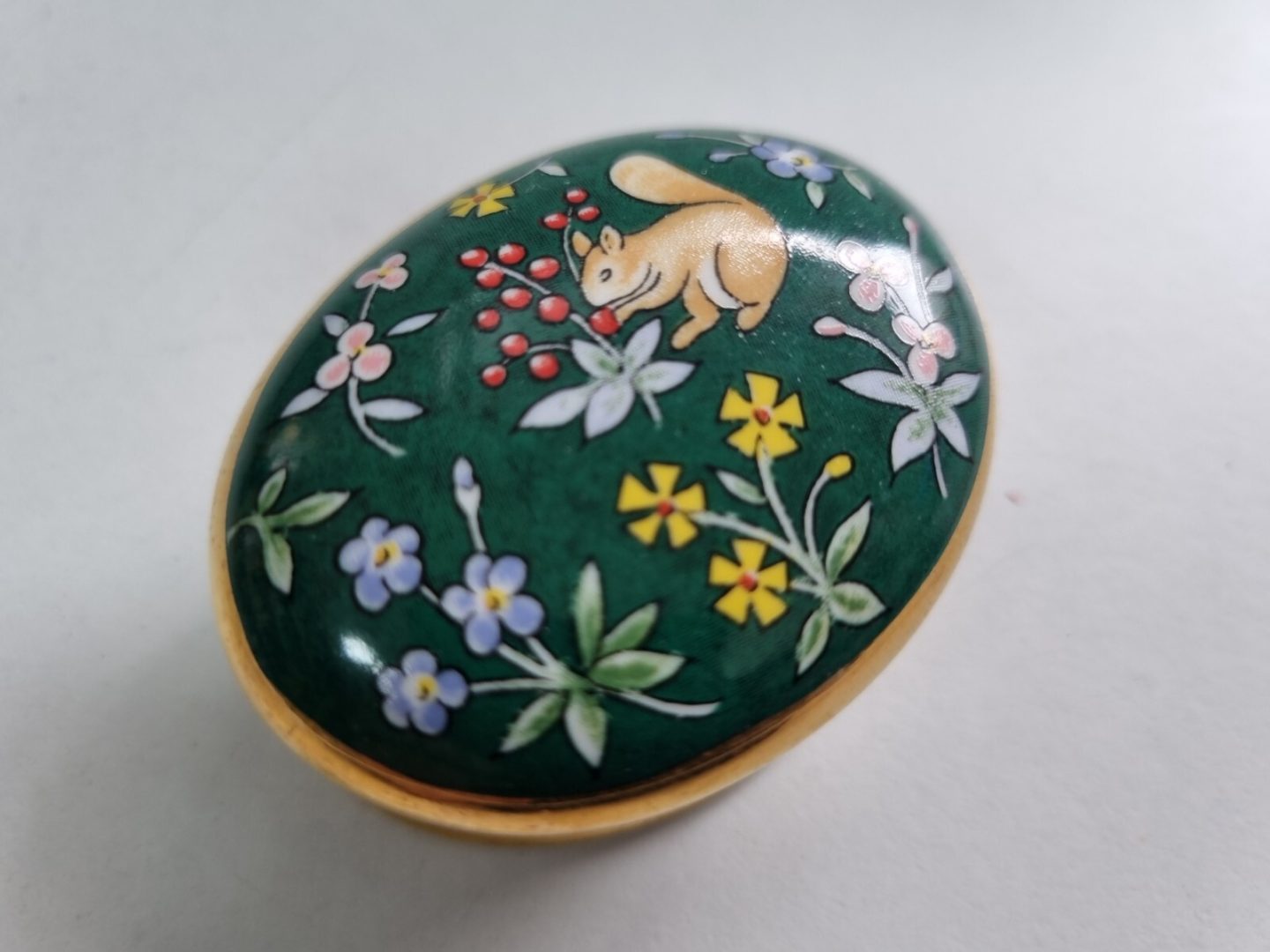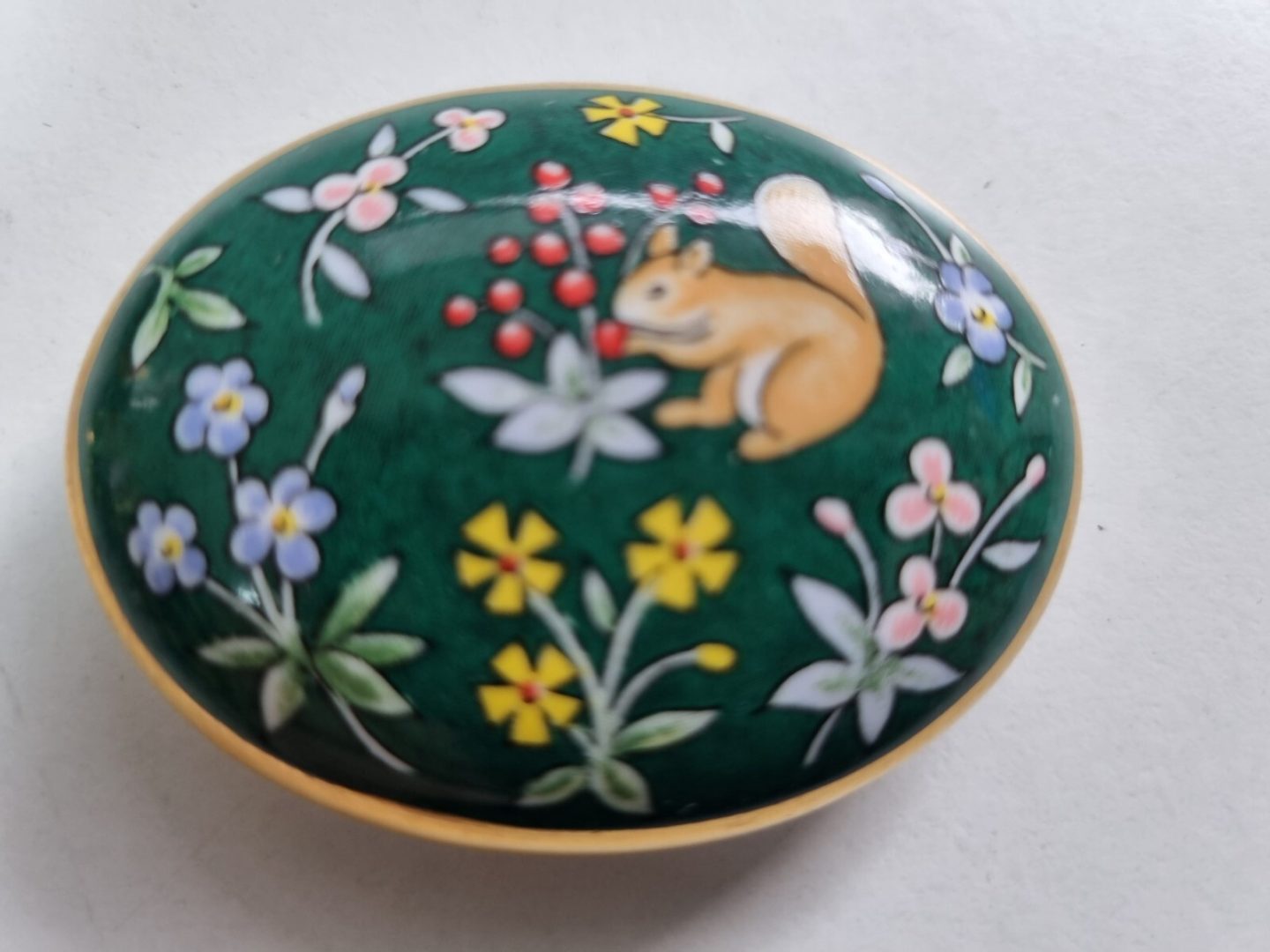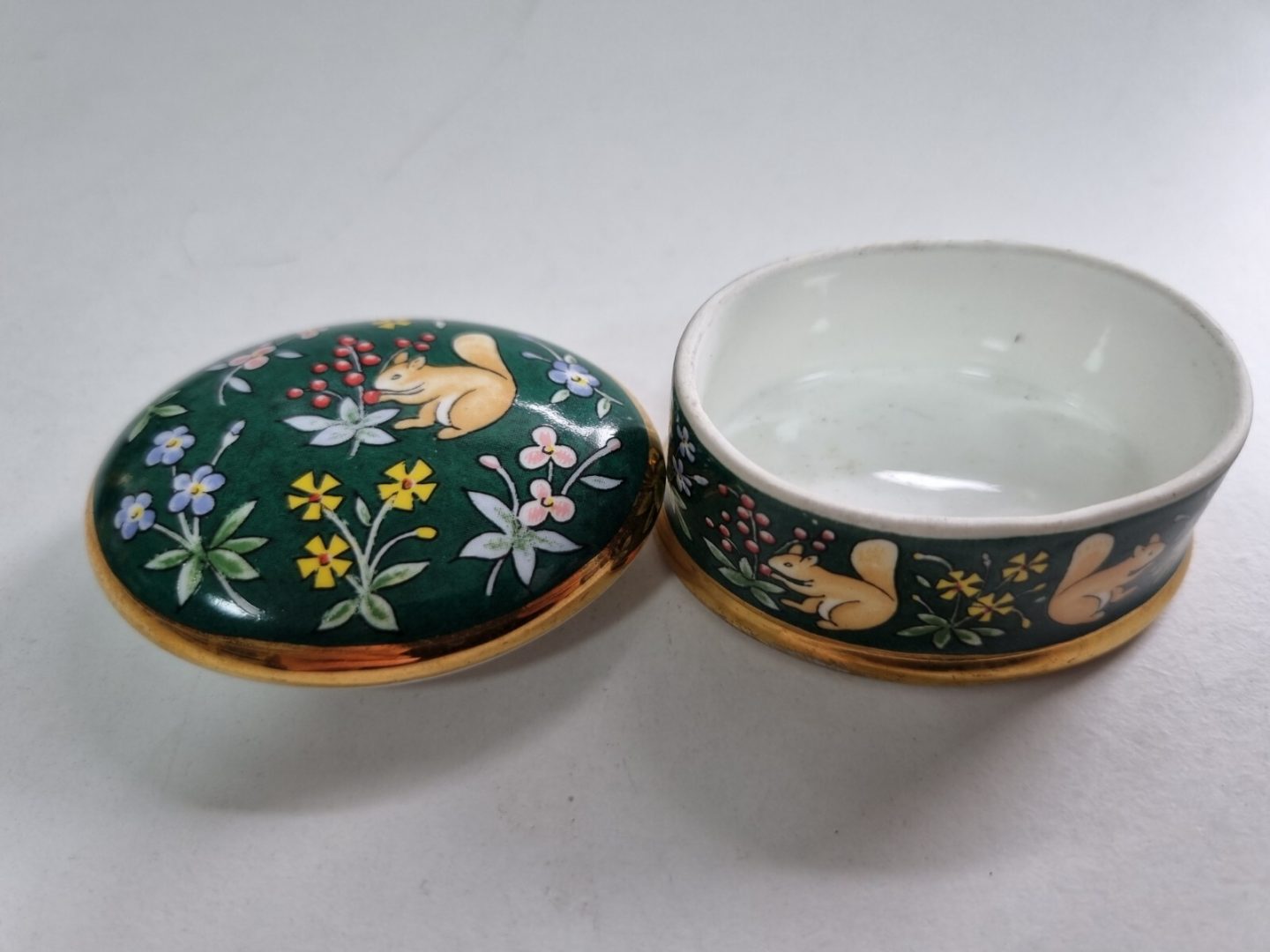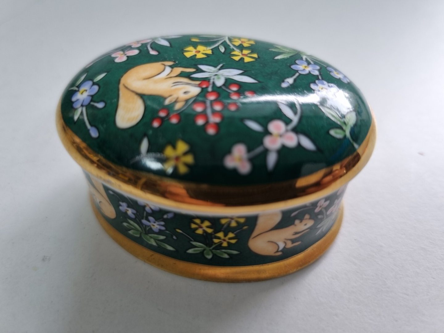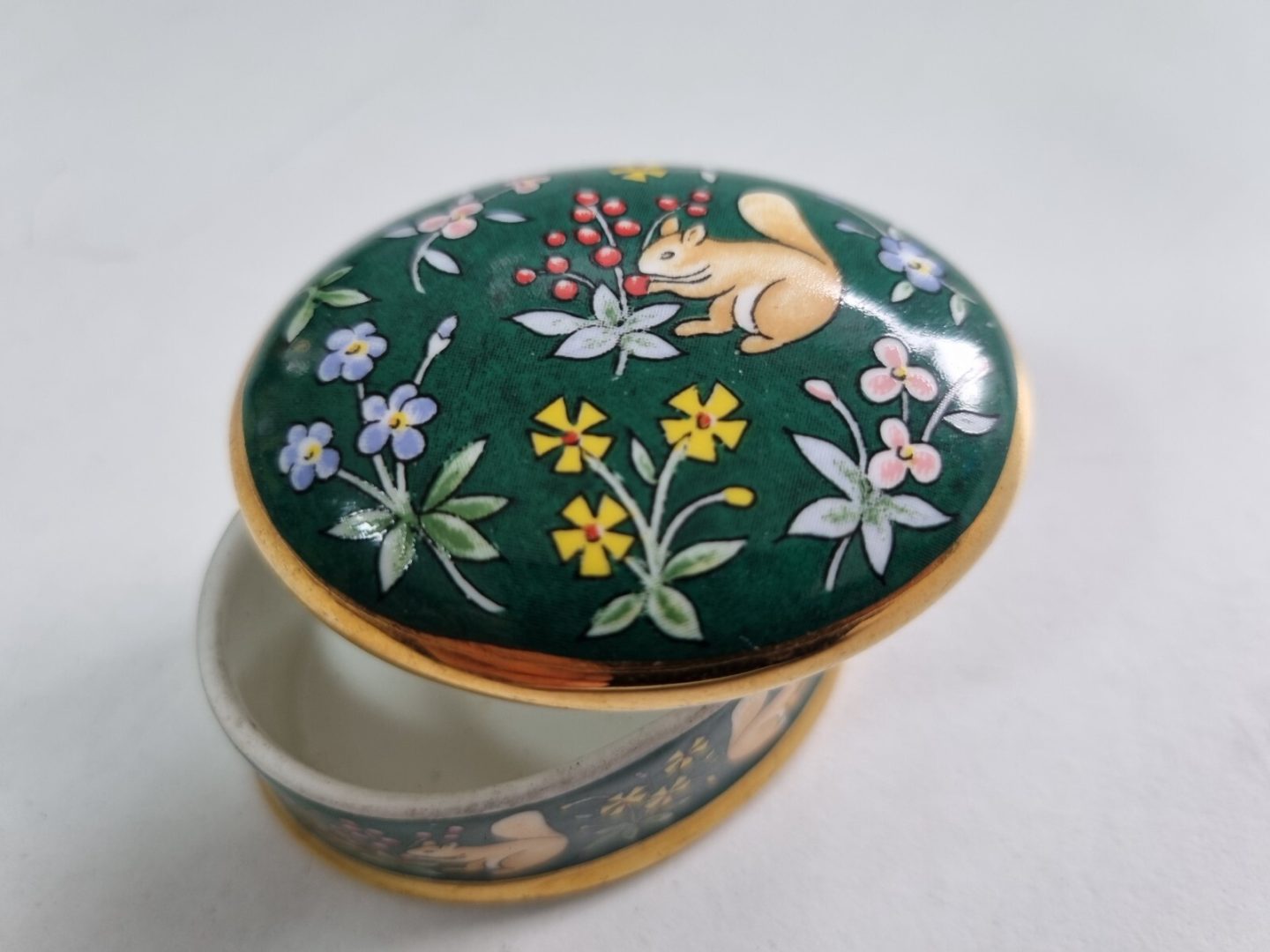Seller note: On sale is a rare Trinket box Hand Painted Squirrel Mille Fleurs Fine Bone China Gold Tone Edge made in England. Size approximately 5.5 cm x 3.5 cm I believe this to be an original item, in very good condition .Please study pictures carefully to decide.