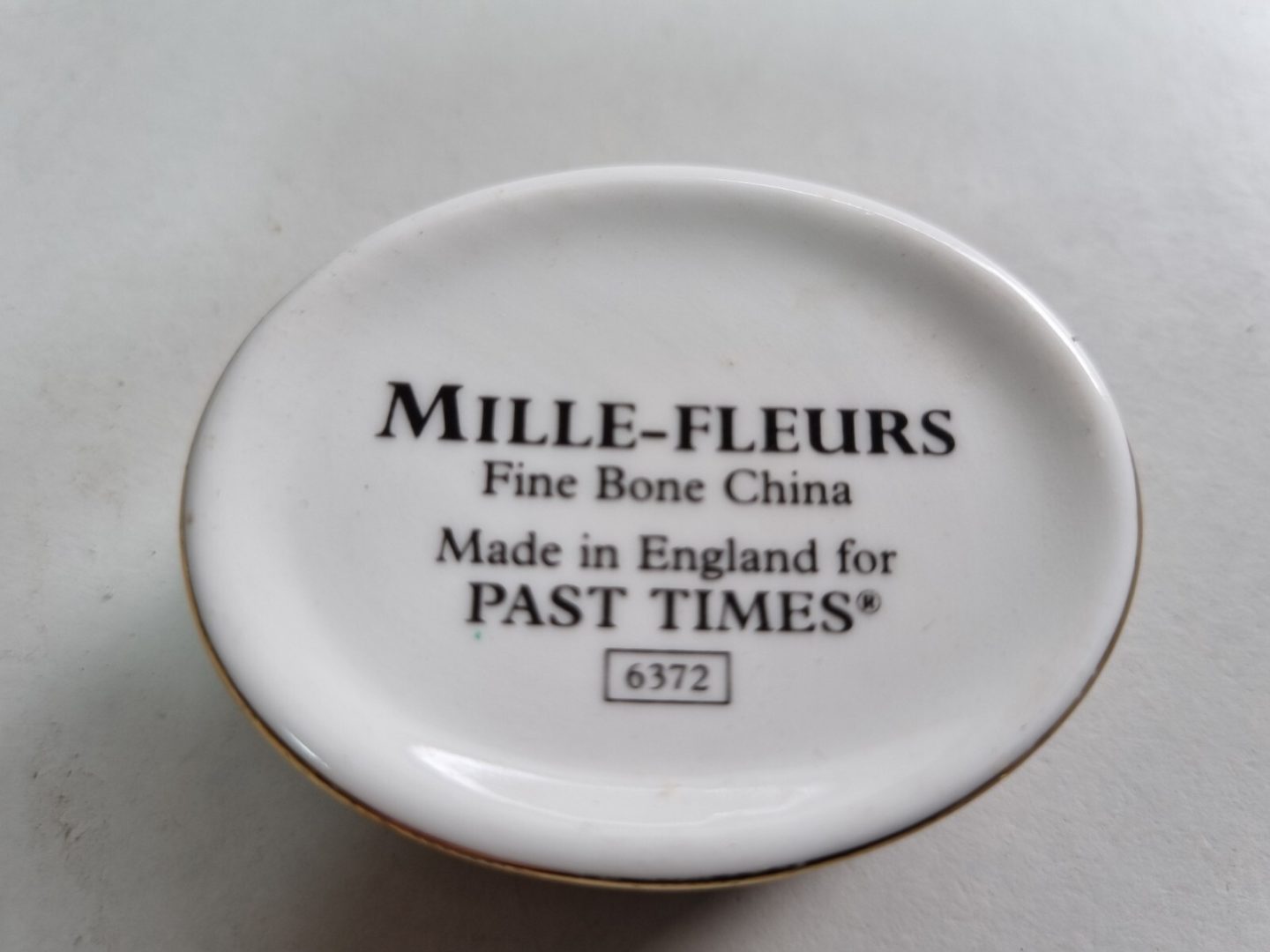 On sale is a rare Trinket box Hand Painted Squirrel Mille Fleurs Fine Bone China Gold Tone Edge made in England. Size approximately 5.5 cm x 3.5 cm I believe this to be an original item, in very good condition .Please study pictures carefully to decide.