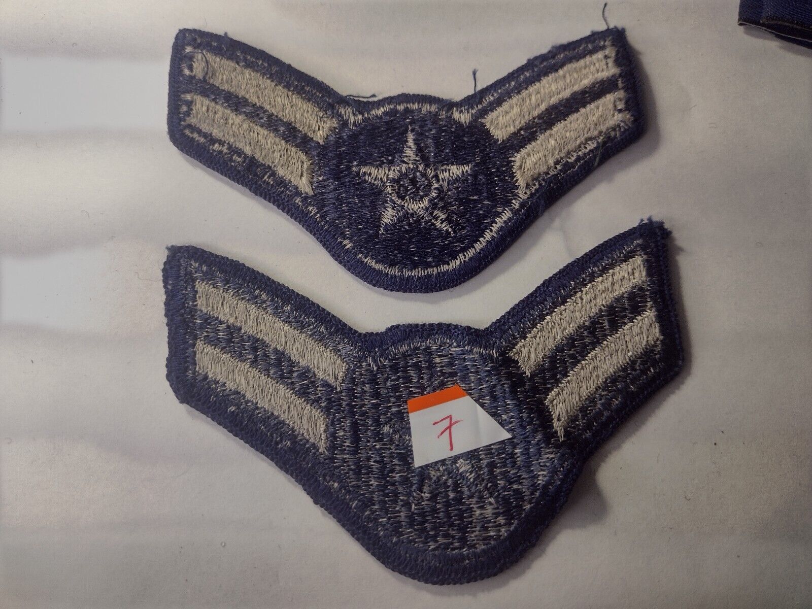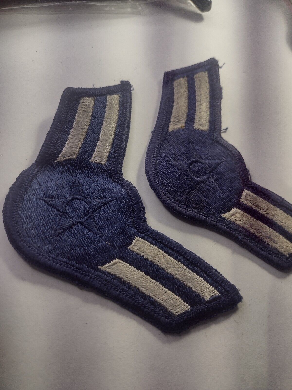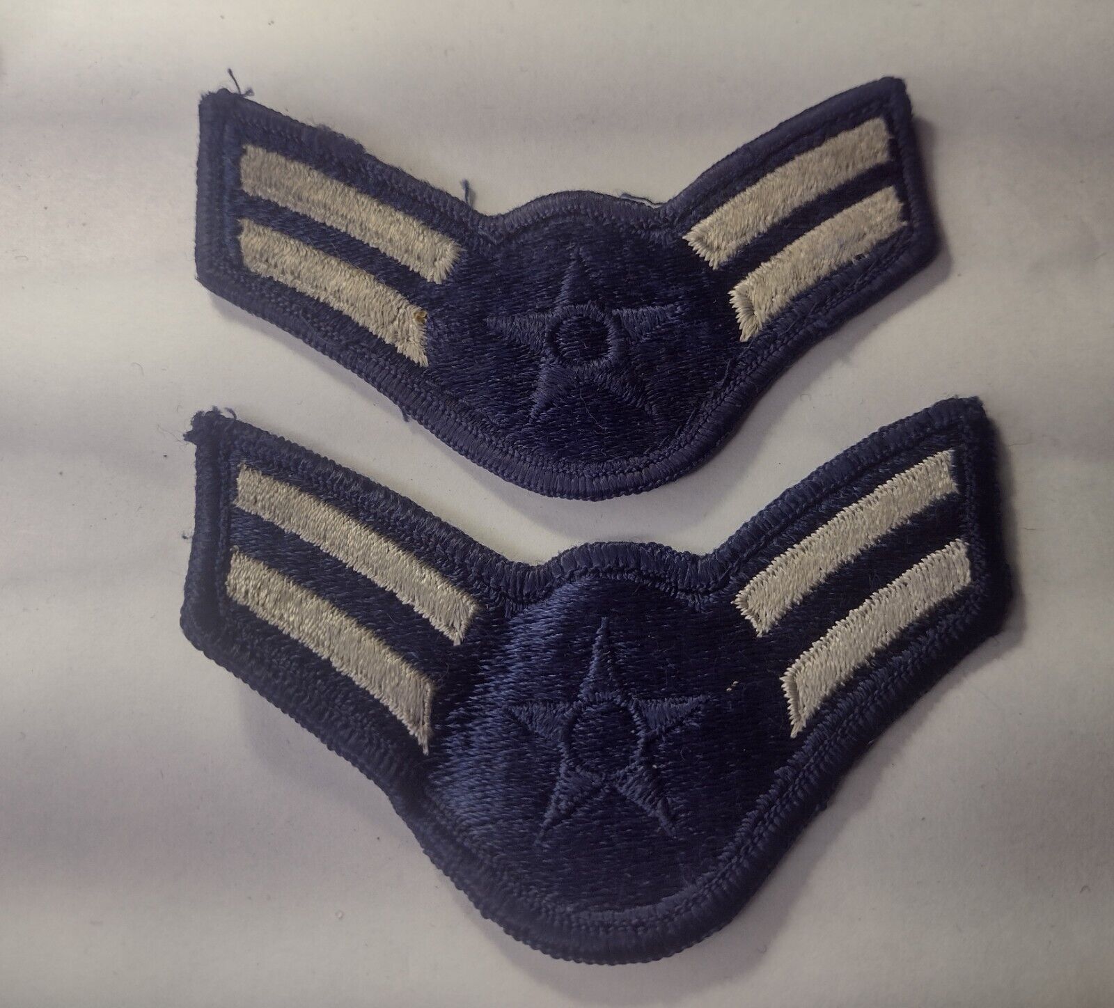 US Air Force Airmen First Class Rank Chevrons Patch White on Navy Blue Used Pair
