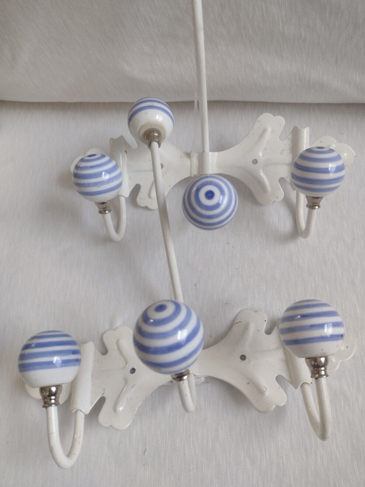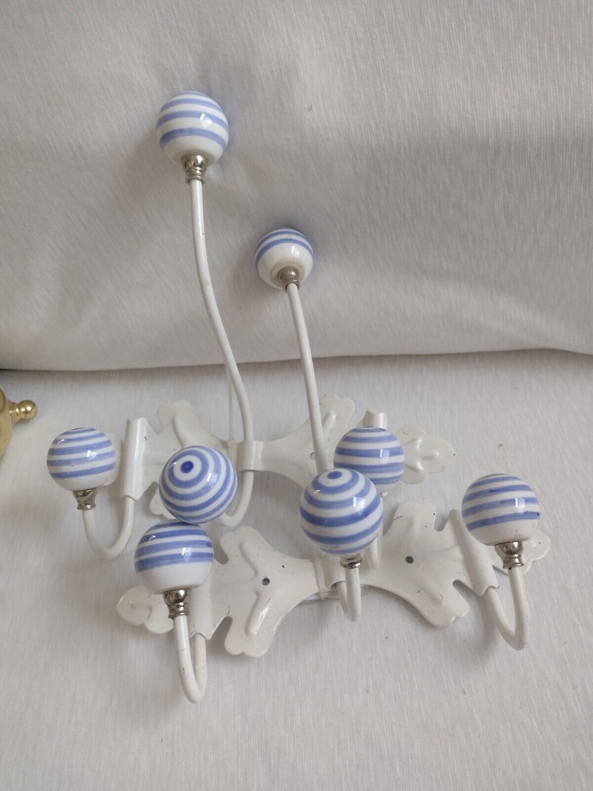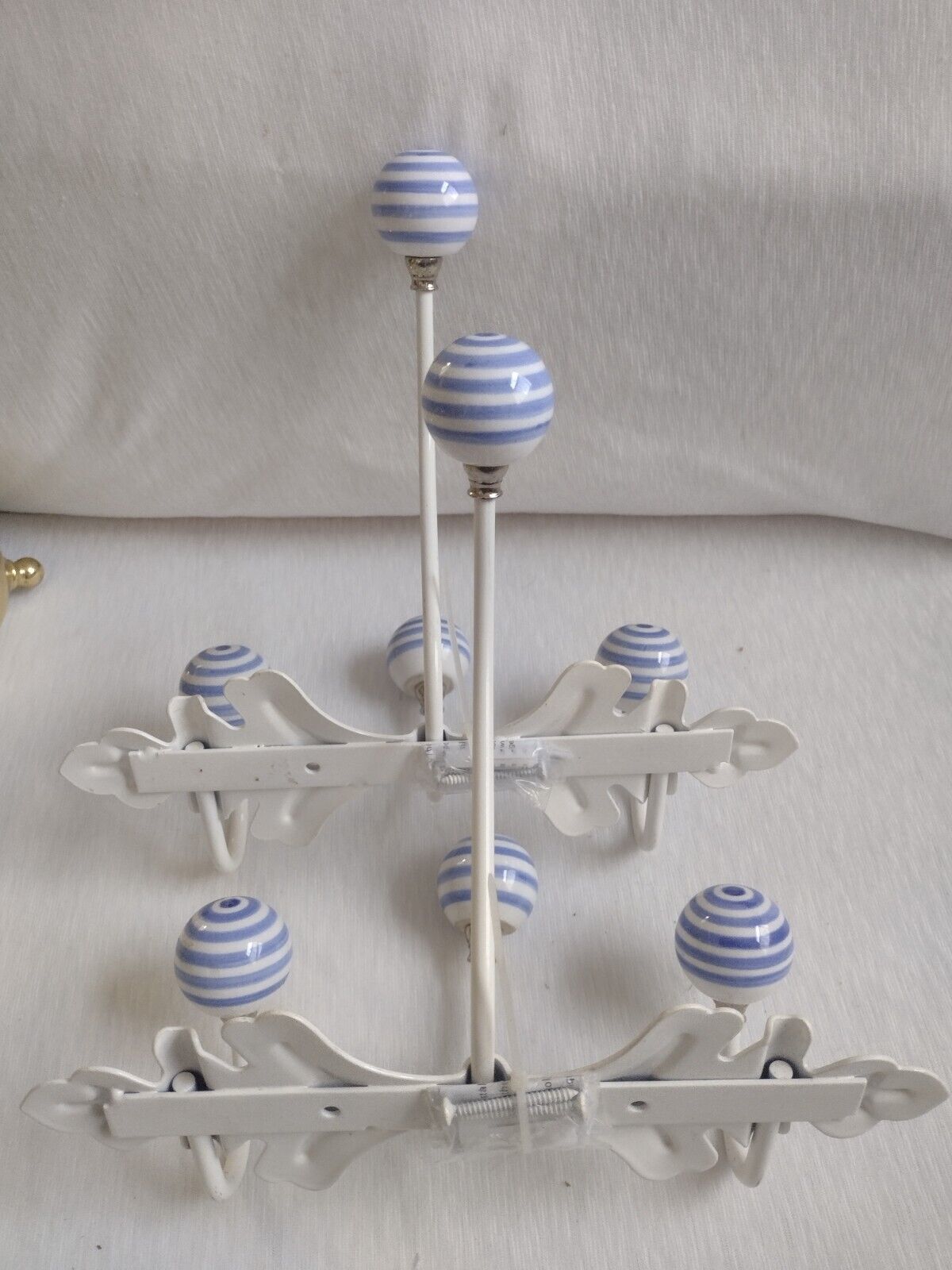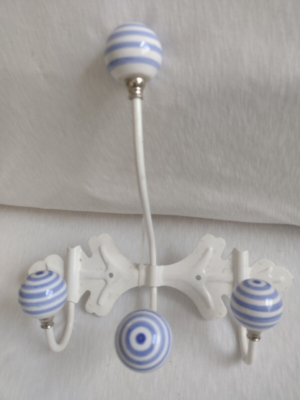 Wall Hanger With White & Blue Striped Ceramic Ball Shaped Knobs Pair New*