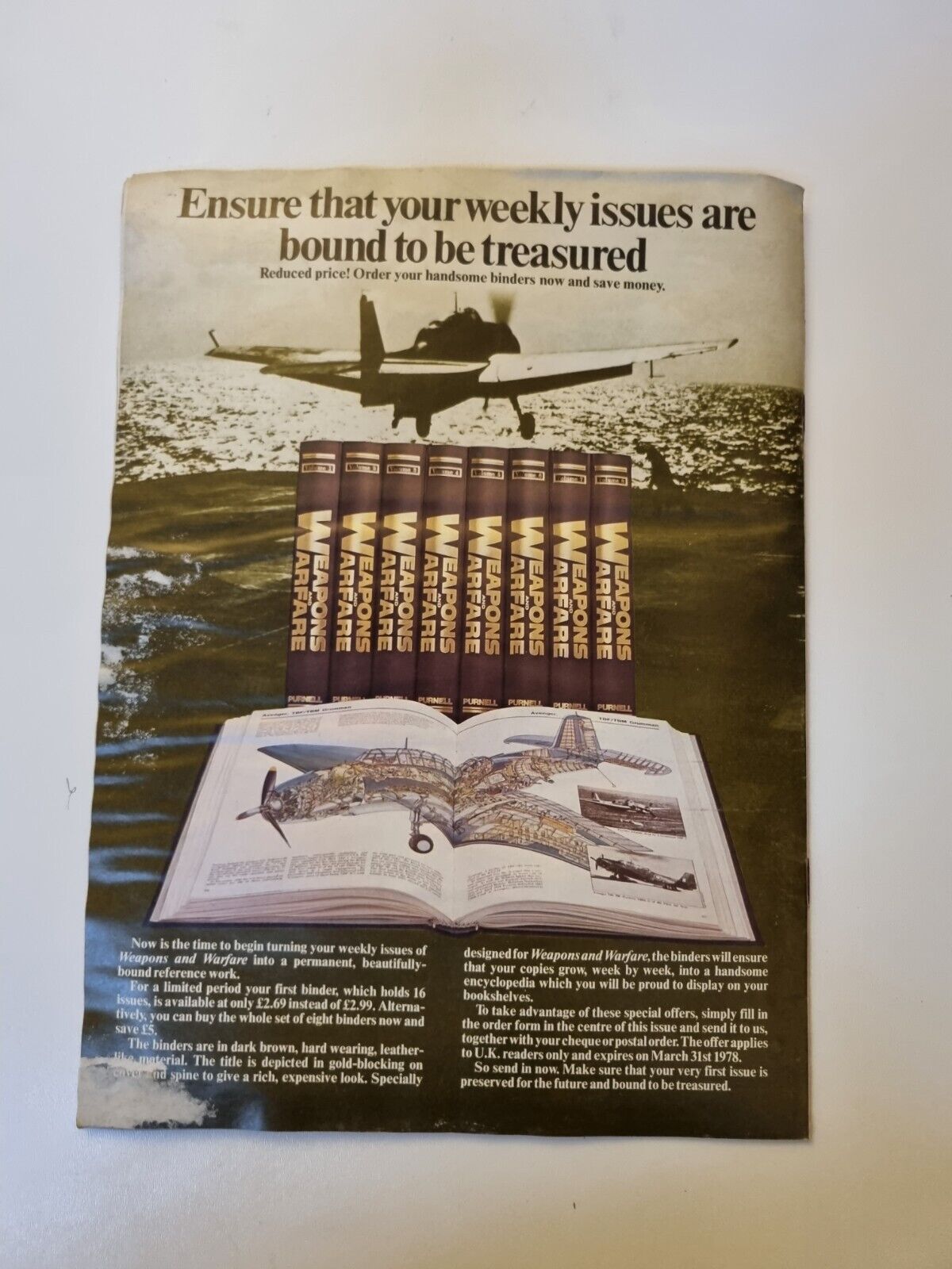"You are purchasing Purnell's illustrated encyclopedia Weapons and Warfare Magazine. The magazine contains photos, diagrams, information of Military Weapons used in War. This lovely magazine as you can see in picture remains in poor condition due to water damage has creasing. Please see the picture as it forms part of the description. Please note you are purchasing the magazine ONLY any supplement or promotional items which was part of the original issue is not included."
