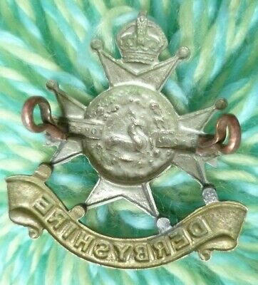 WW1 Derbyshire Regiment Cap Badge KC Bi-Metal 2 Lugs ANTIQUE Org