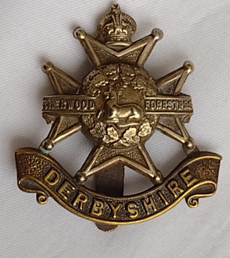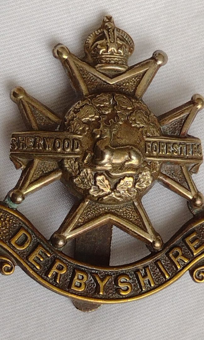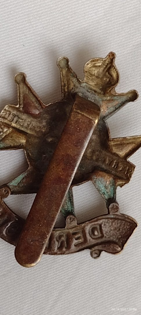 WW1 Derbyshire Regiment Cap Badge KC Bi-Metal Slider Antique Original