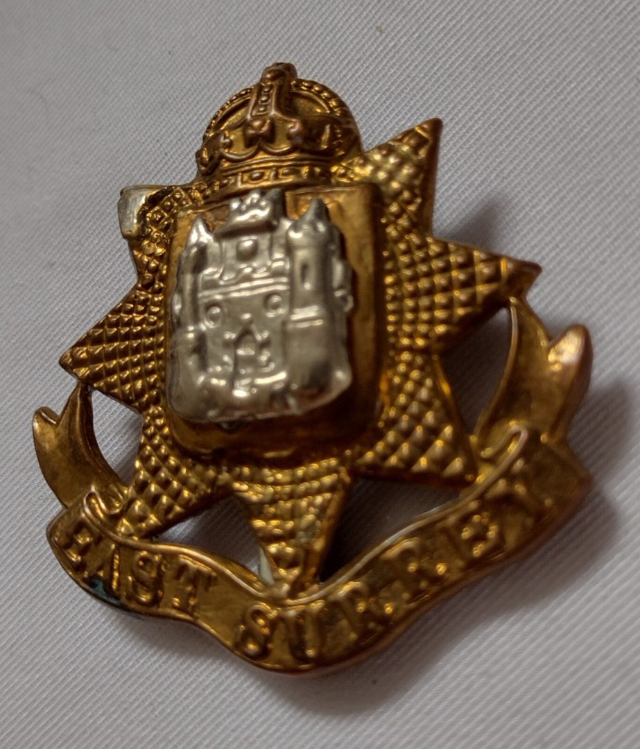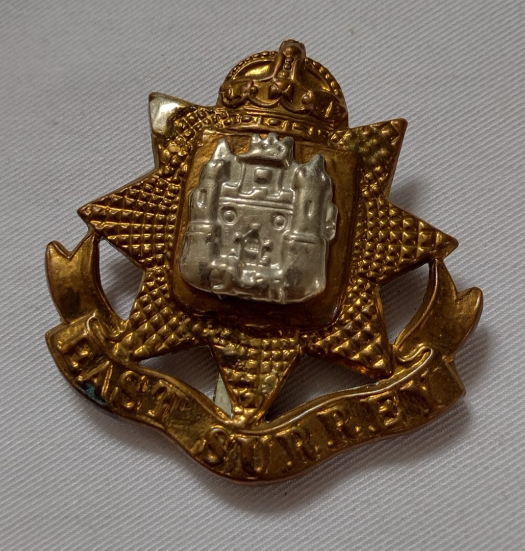 WW1 East Surrey Regiment Cap Badge KC Slider Bi-metal 44mm Antique Original
