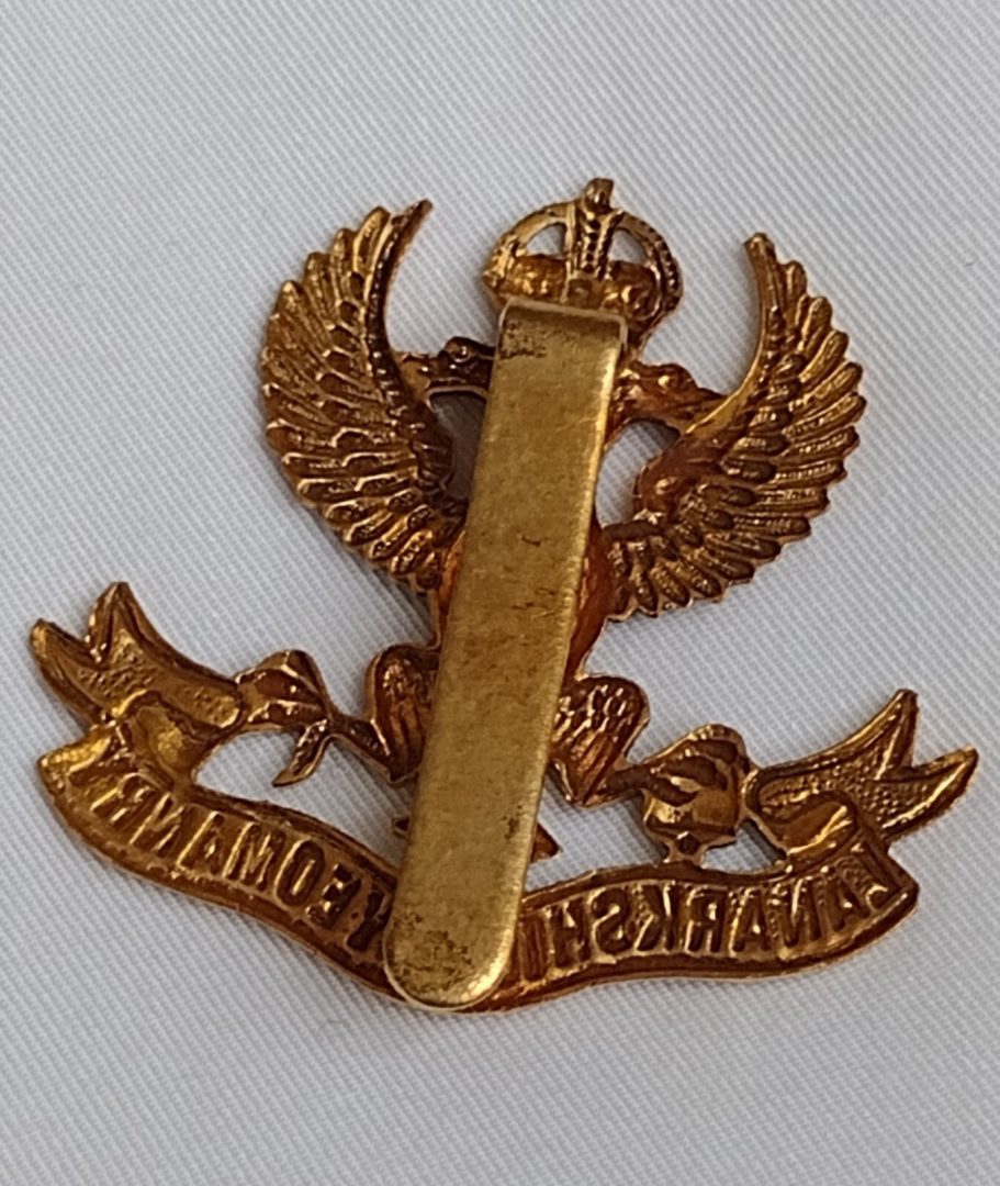 WW1 Lanarkshire Yeomanry Lancers Cap Badge KC Gilding Metal Slider Antique