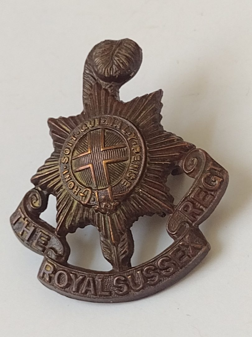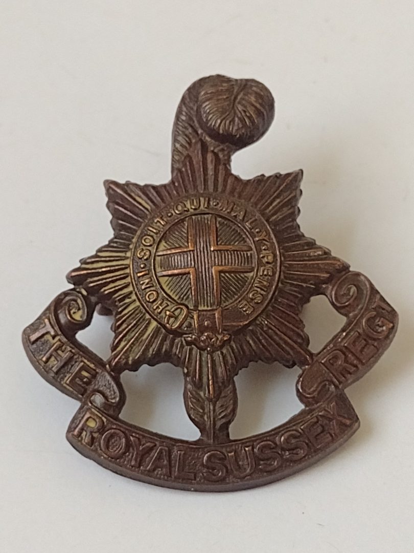 WW1 Original The Royal Sussex Regiment Cap Badge Bronze 2 Lugs Antique