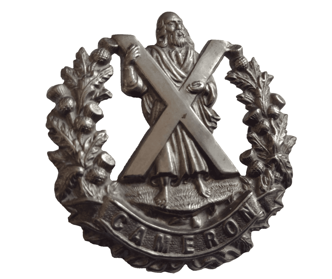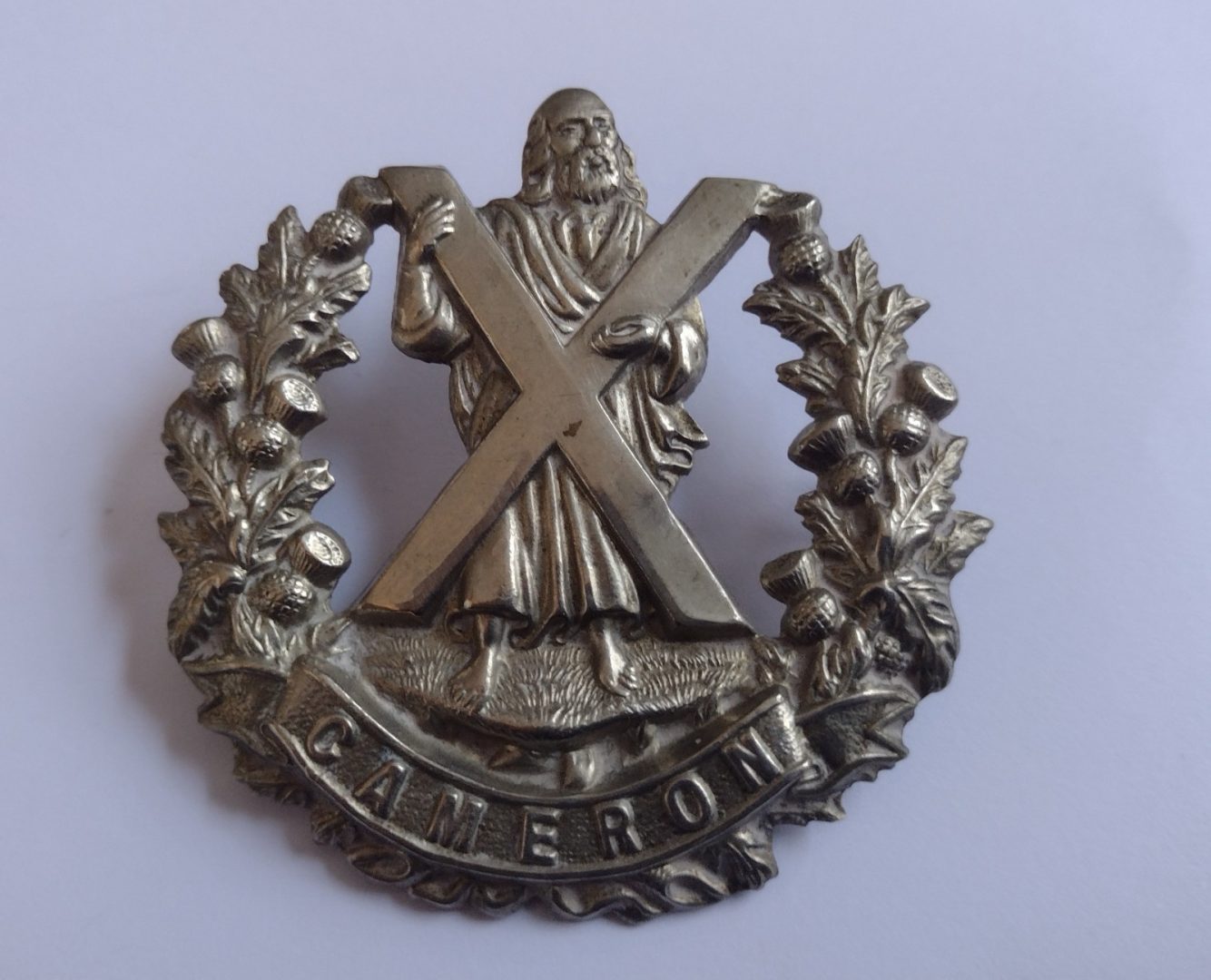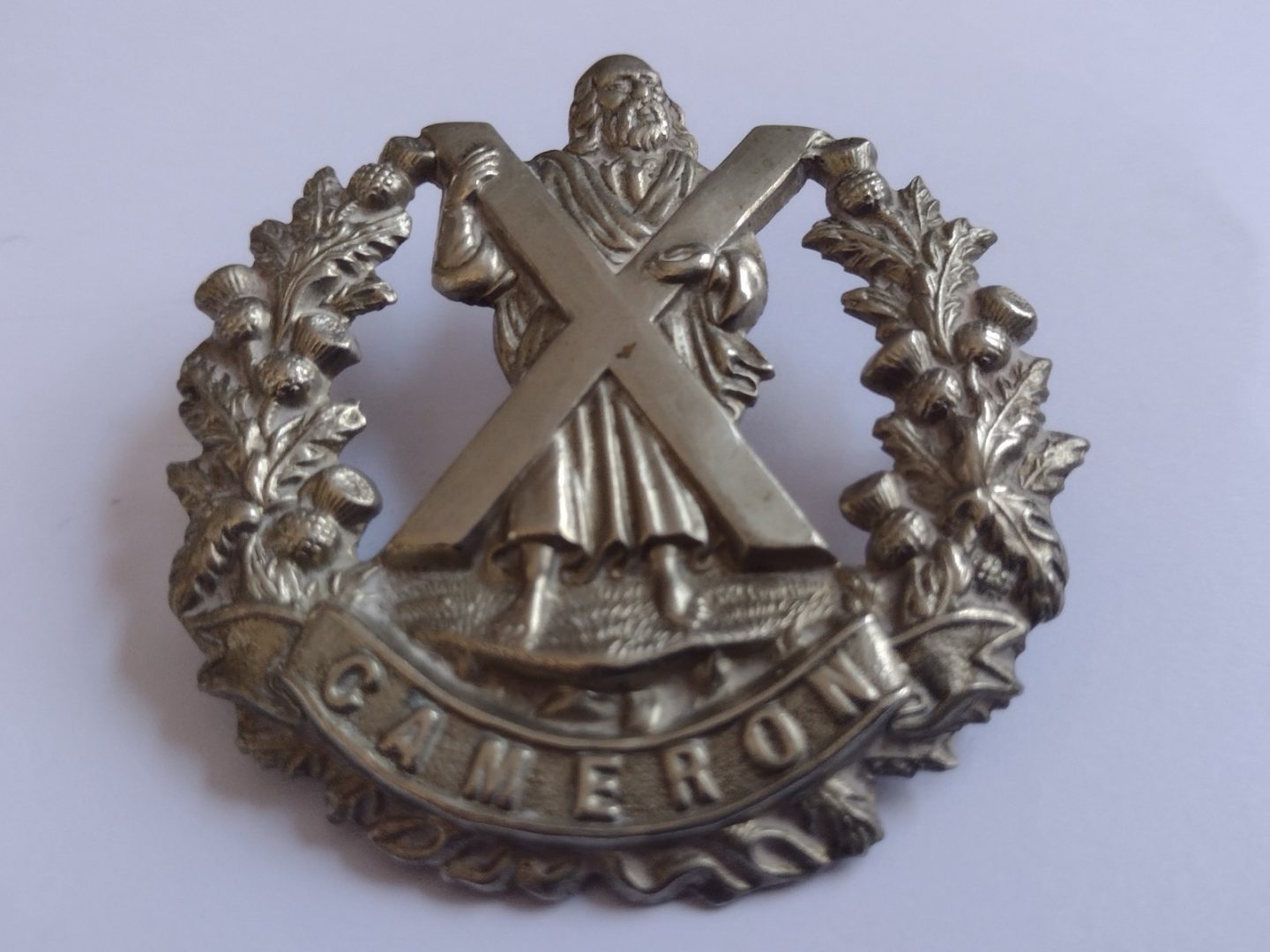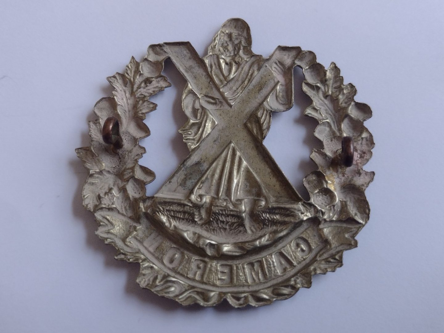 WW1 Queen’s Own Cameron Highlanders Cap Badge White Metal Antique – Original