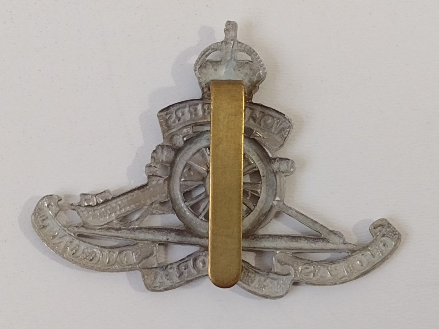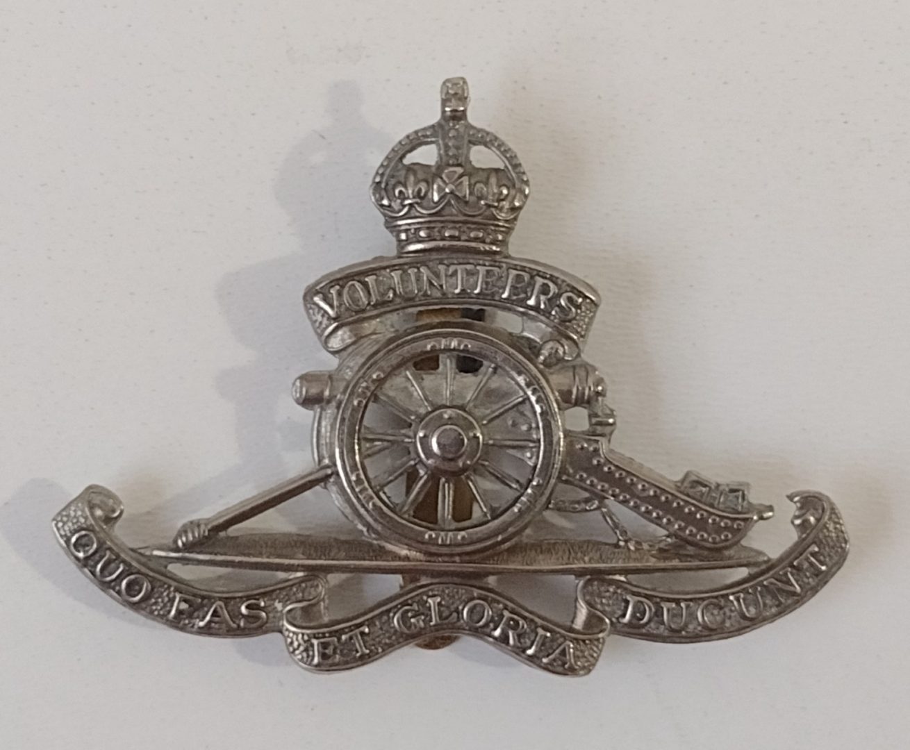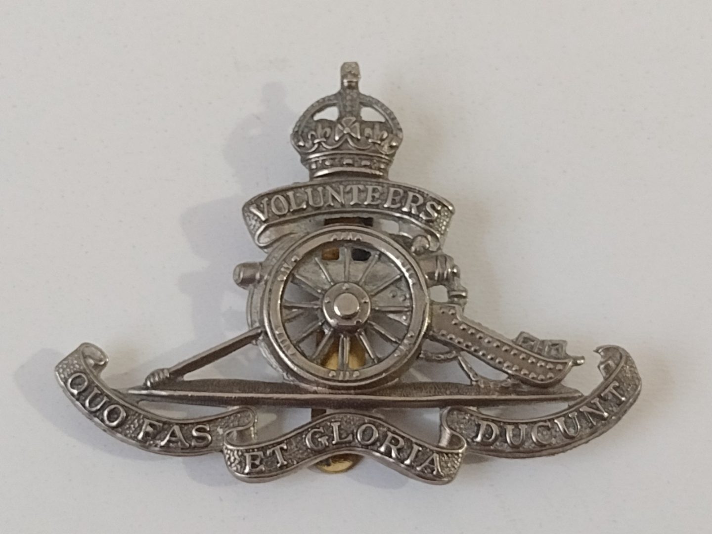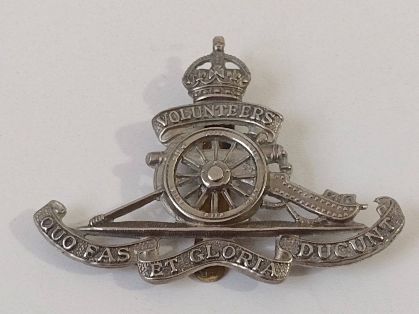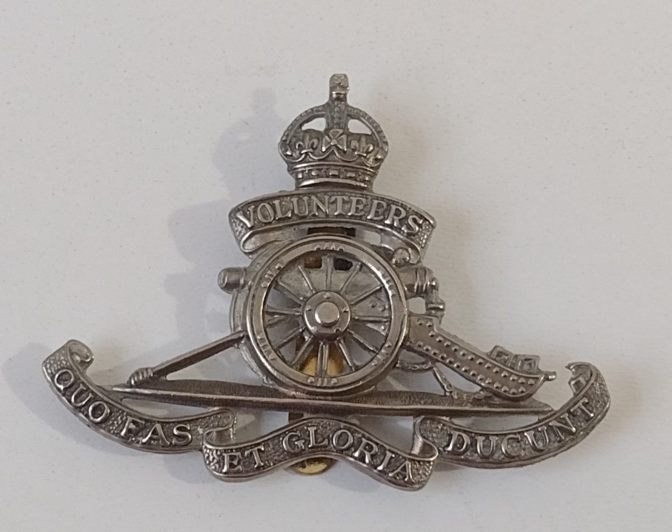 WW1 Royal Artillery Volunteers Cap Badge KC White Metal Slider Original