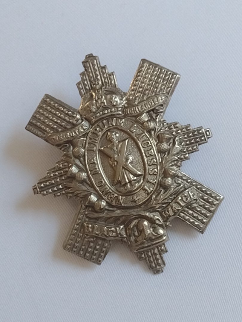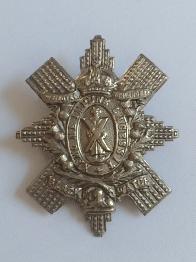 WW1 Royal Highlanders Black Watch Cap Badge KC White Metal 2Lug 76mm Antique Org