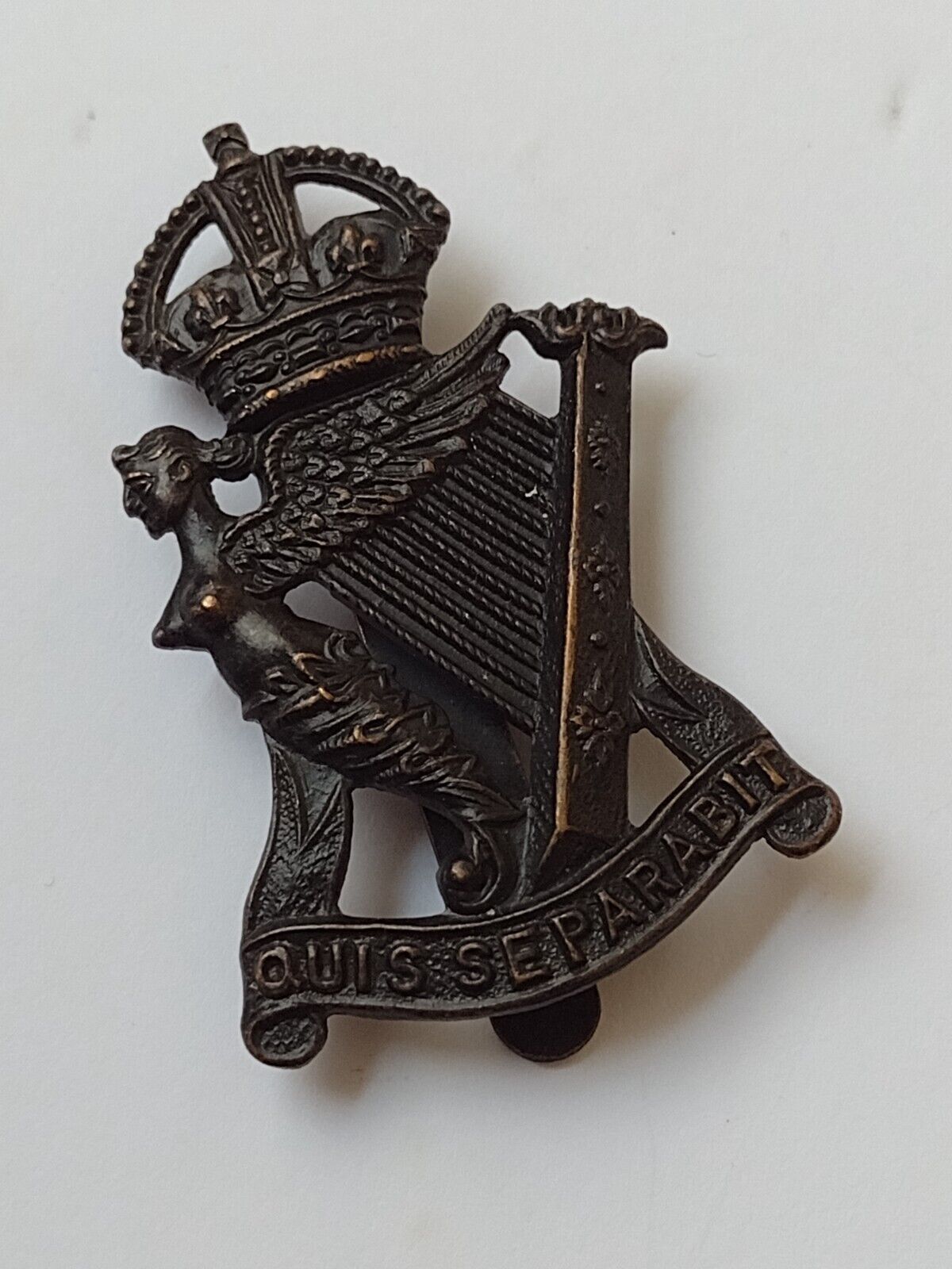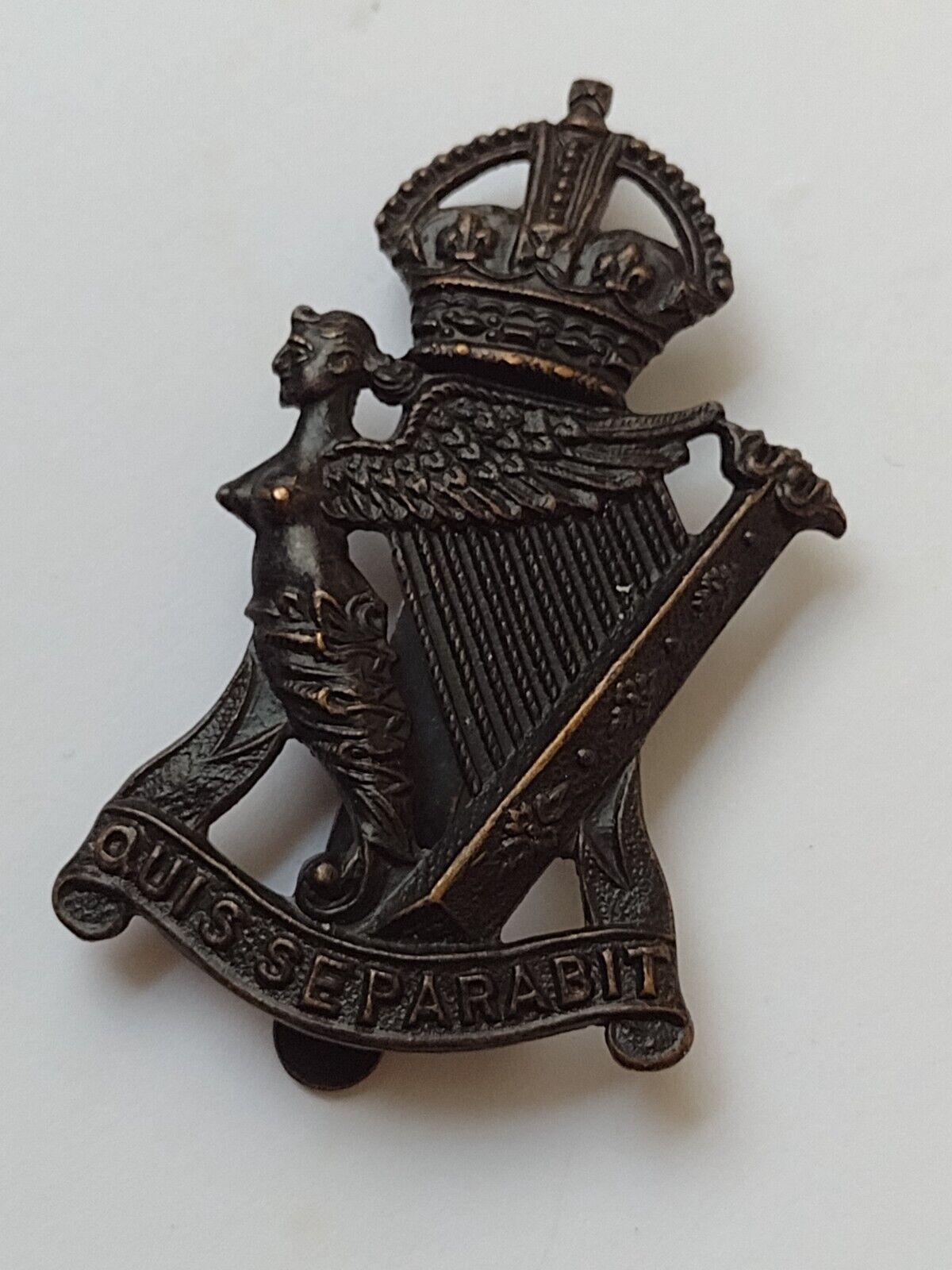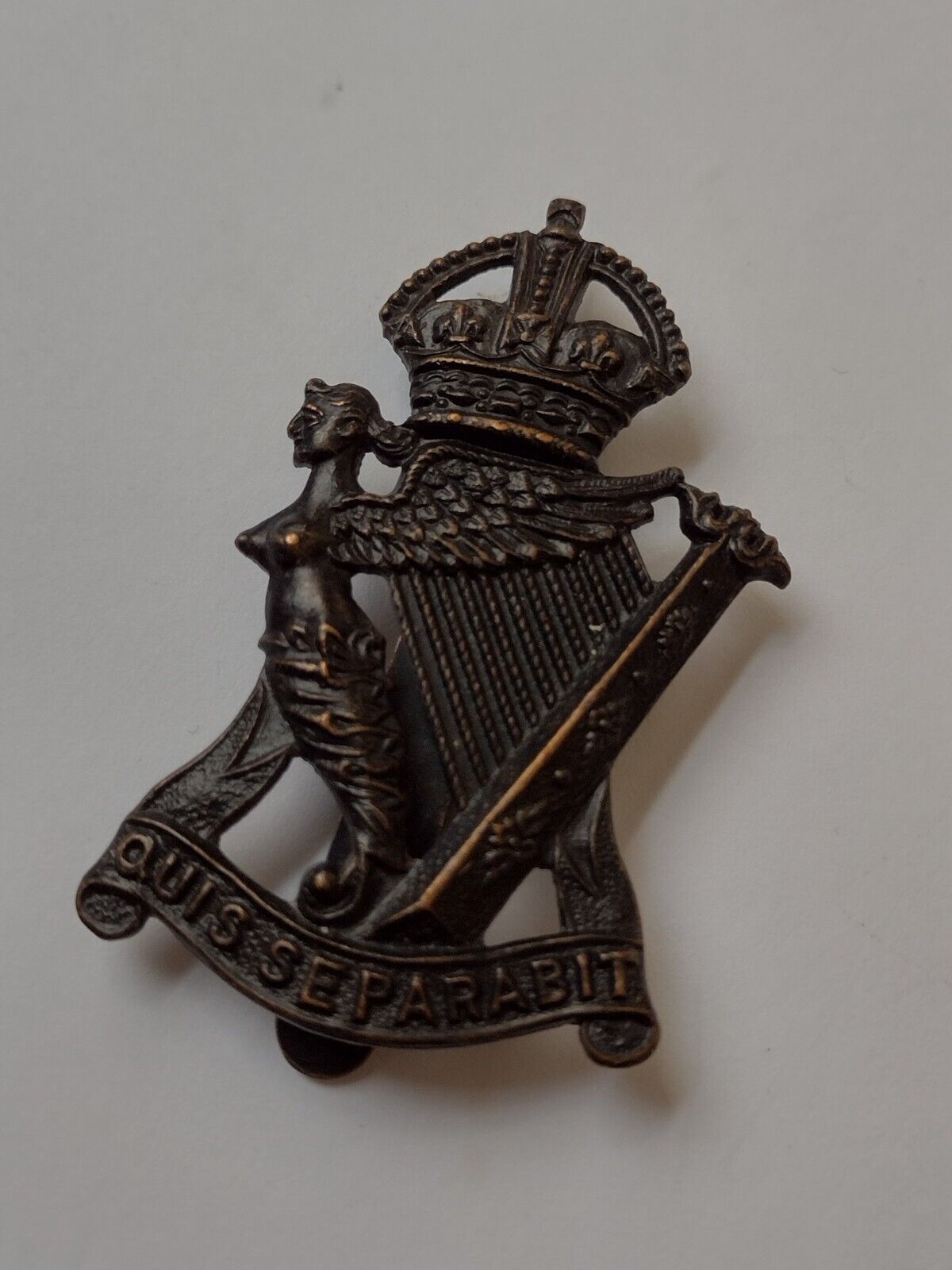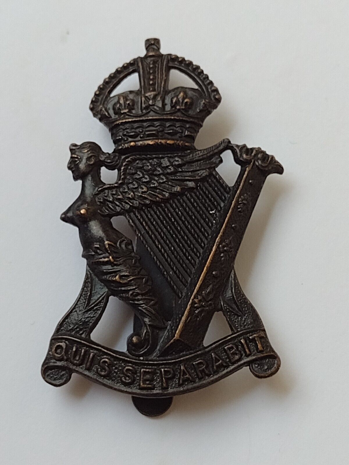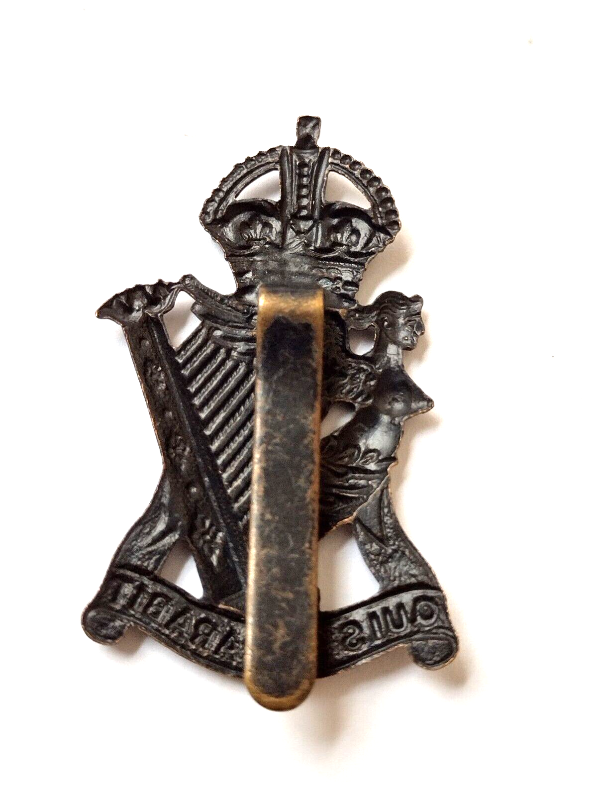 WW1 Royal Irish Rifles Cap Badge KC Blackened Brass Slider 52mm Antique Original