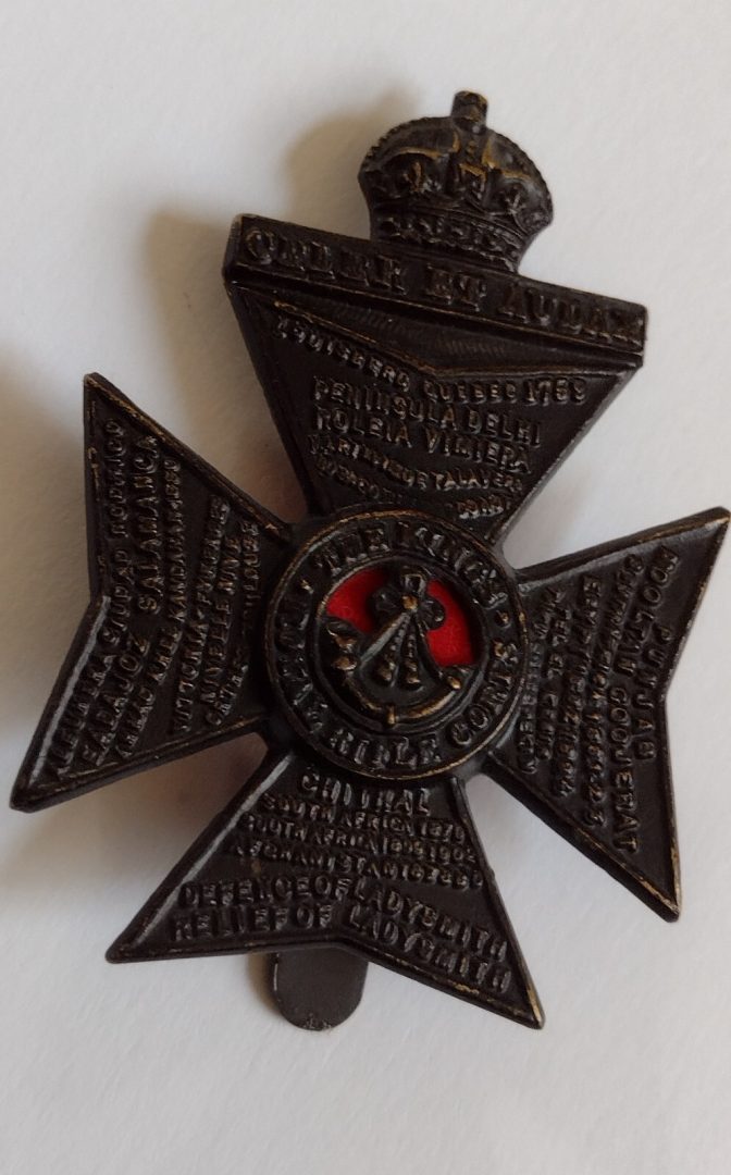 WW1 The Kings Royal Rifle Corps Cap Badge KC Half Voided Blackened Brass ANTIQUE