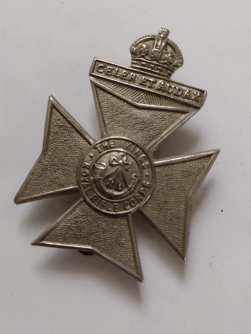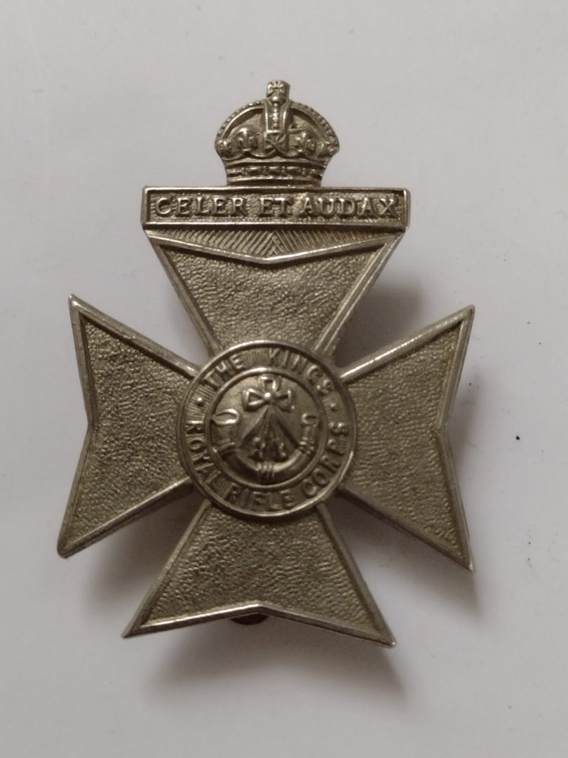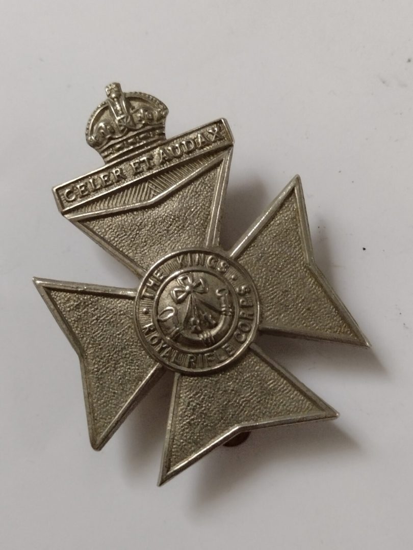 WW1 The King’s Royal Rifle Corps Cap Badge KC White Metal Slider 54mm Antique