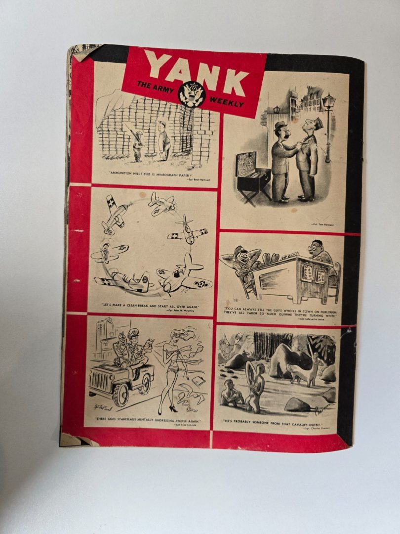 Yank was written and edited exclusively by enlisted men for fellow service members to boost morale and keep them informed. These Magazines featured stories such as “How U.S. Military Government Works in Germany” and various reports from the front lines in Europe and the Pacific. The magazine provided soldiers with a mix of serious news, sports, and humour including the famous “Sad Sack” cartoons.
