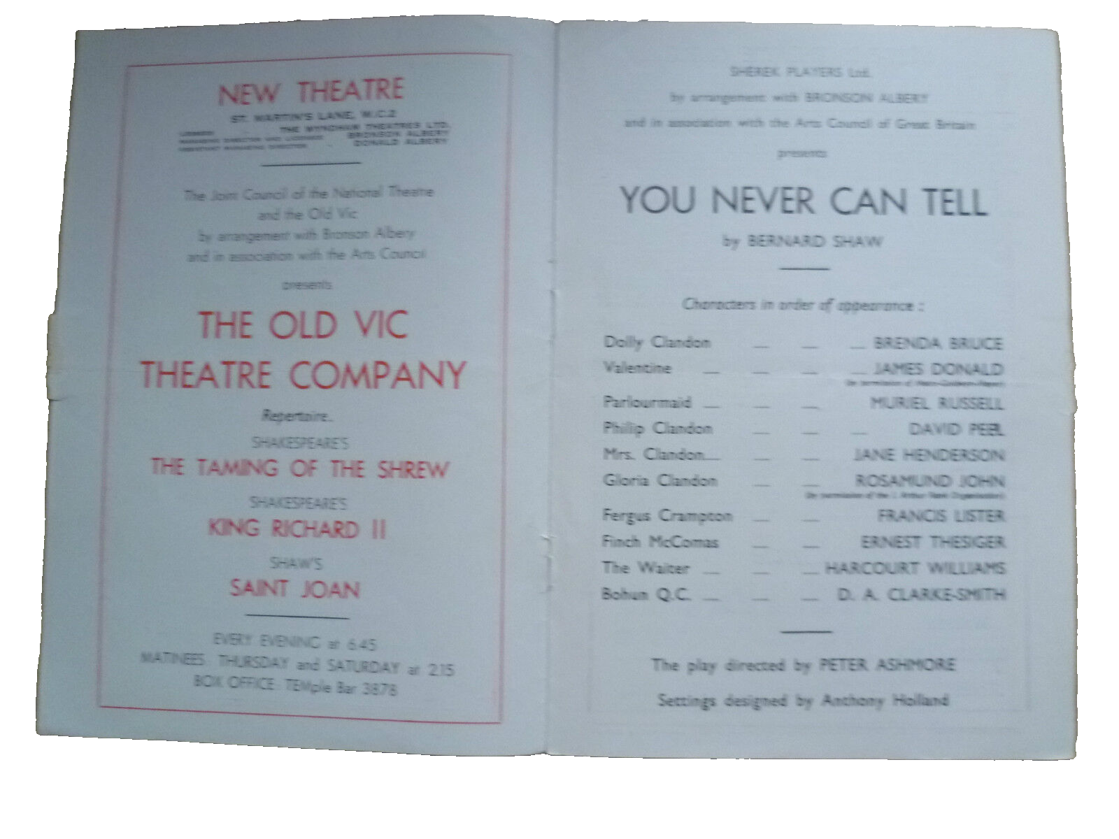 You are purchasing Original vintage: 1947 Wyndham’s theatre Programme- YOU NEVER CAN TELL by Bernard Shaw